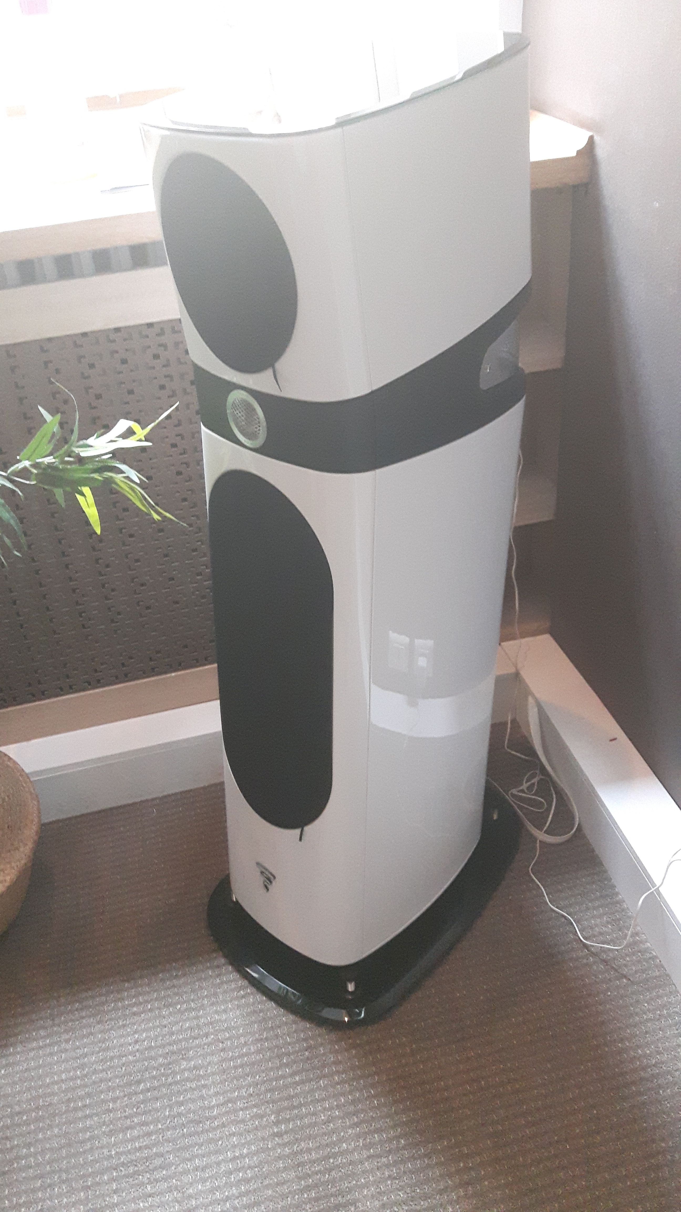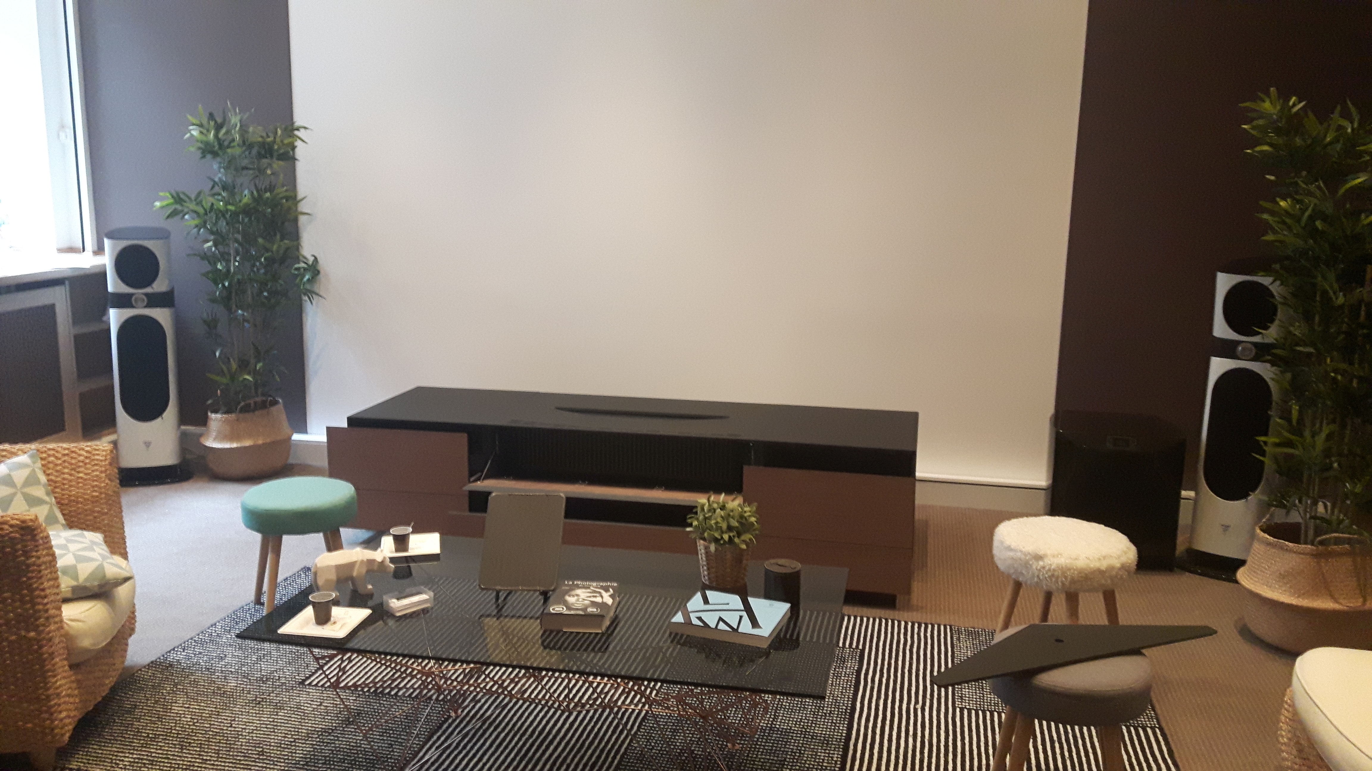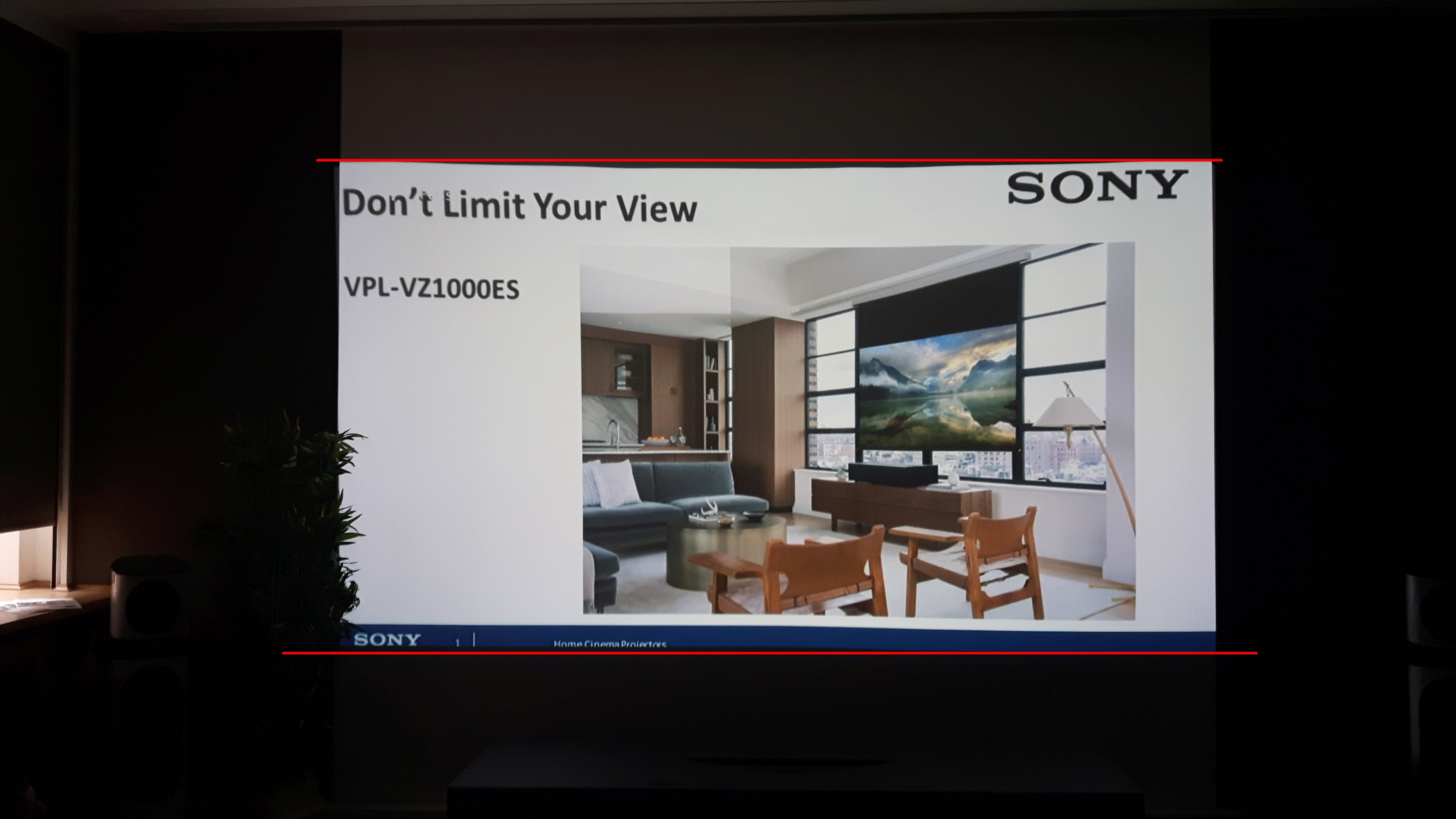 Vendu 25000€ (le VPL-VZ1000ES avec son meuble), le concept permet de remplacer une télévision sans dénaturer le salon en projetant directement sur le mur. La pièce, très sobre, ressemble à un salon contemporain. Les murs peints sont marron clair et le plafond blanc mat. Seule la zone de projection est en blanc satiné.