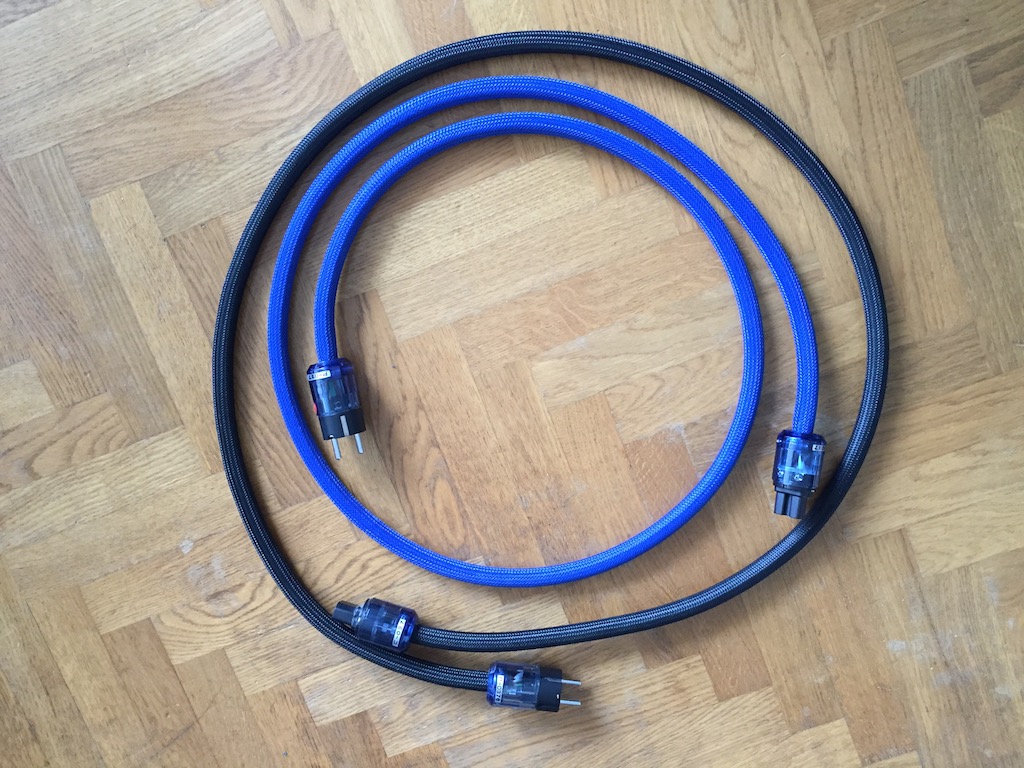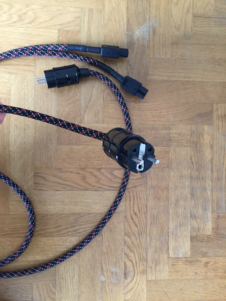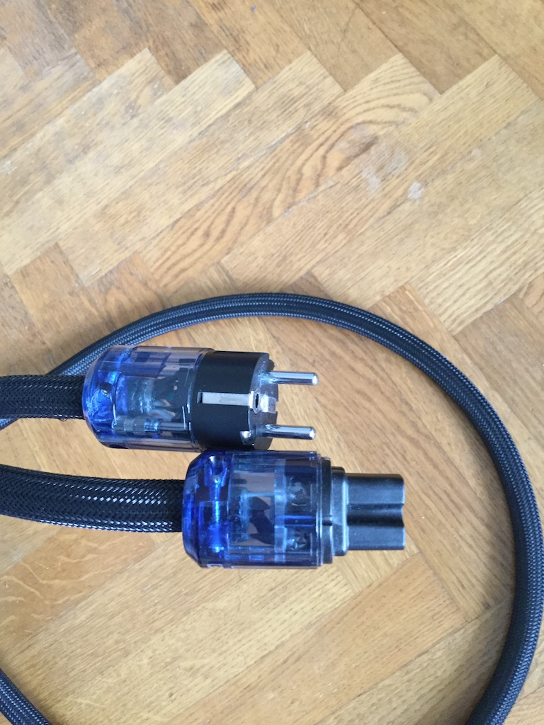 Câble en 4mm2, Monster 400 power line series signature, IEC et Schuko pseudo Oyaide, câblé en masse totale côté schuko. Gaine tressée standard noire ou bleue.