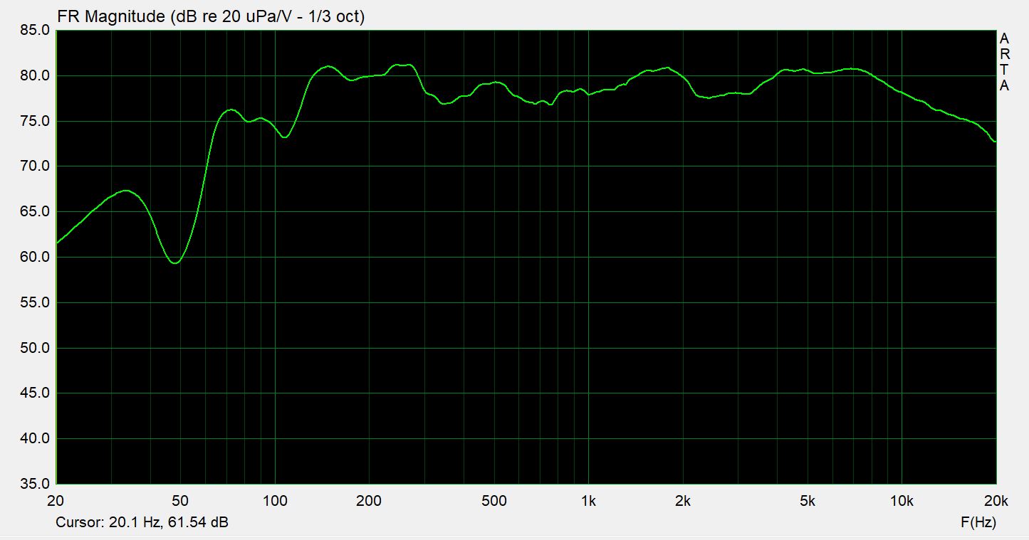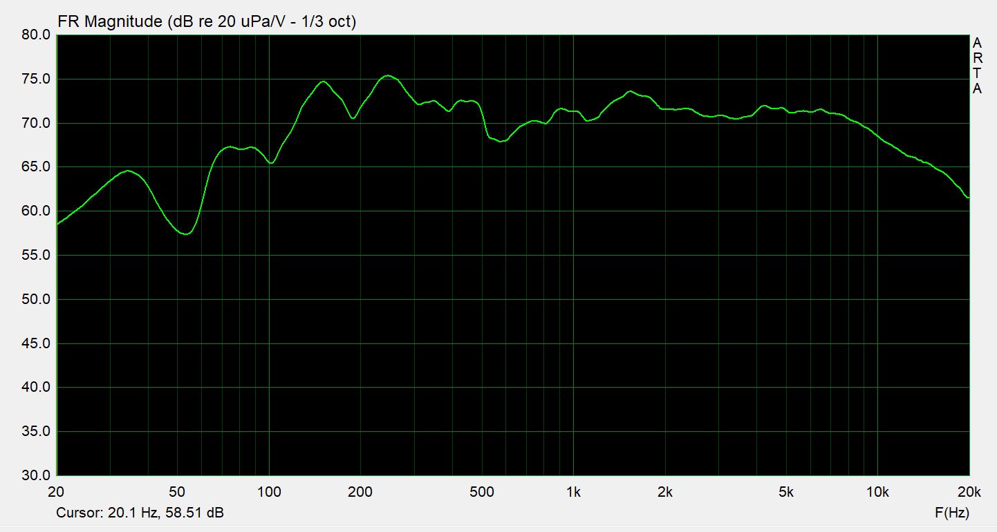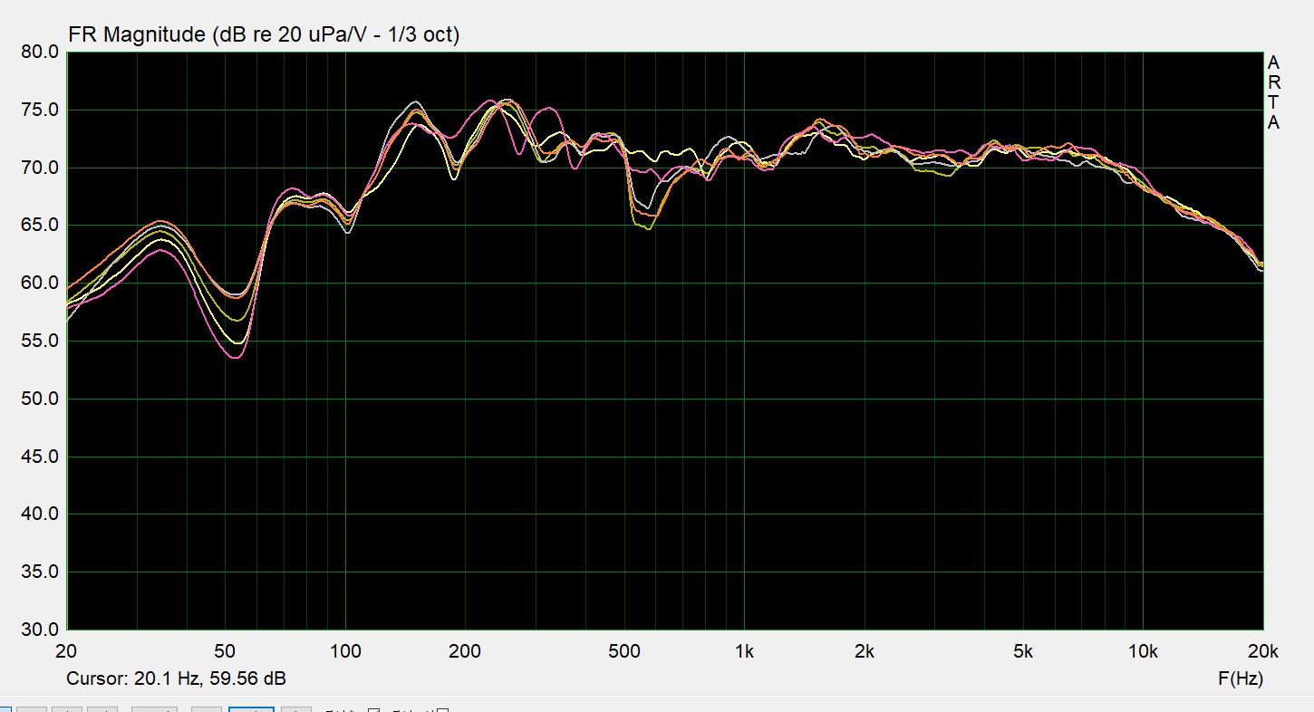 La bosse 150/250Hz est principalement due à la hauteur du micro; si j'élève ce dernier elle disparait en grande partie. Il subsiste un léger surcroît d'énergie à 1.5kHz, constaté également avec d'autres enceintes, mais dans une moindre mesure. Cette bosse n'existe pas en mesure fenêtrée enceinte réhaussée, dans l'axe ou même en (pseudo) mesure en puissance. Il me faudra peut-être investiguer plus avant...