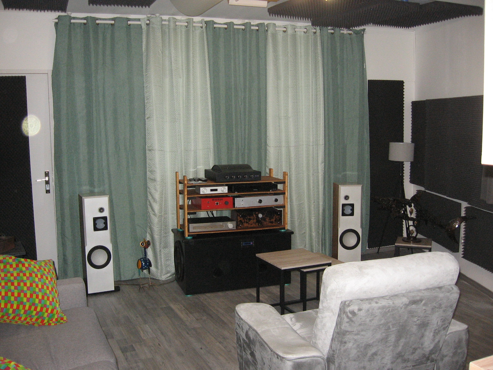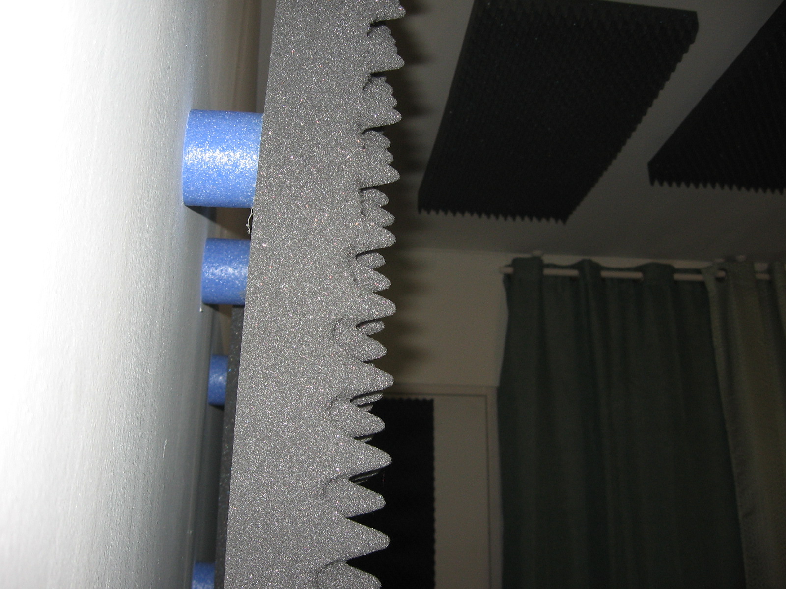 Traitement a priori terminé: 12 plaques de mousse 1000 x 500 Thomann HiLo-N70 et 12 plaques N40 disposées sur plafond et murs latéraux aux emplacements des 1ères réflexions et à proximité. Les mousses ont été écartées des murs de 3 à 5cm et collées sur des plots de mousse compacte taillés dans des frites de piscine (2.5€ pièce), eux-mêmes vissés aux murs.