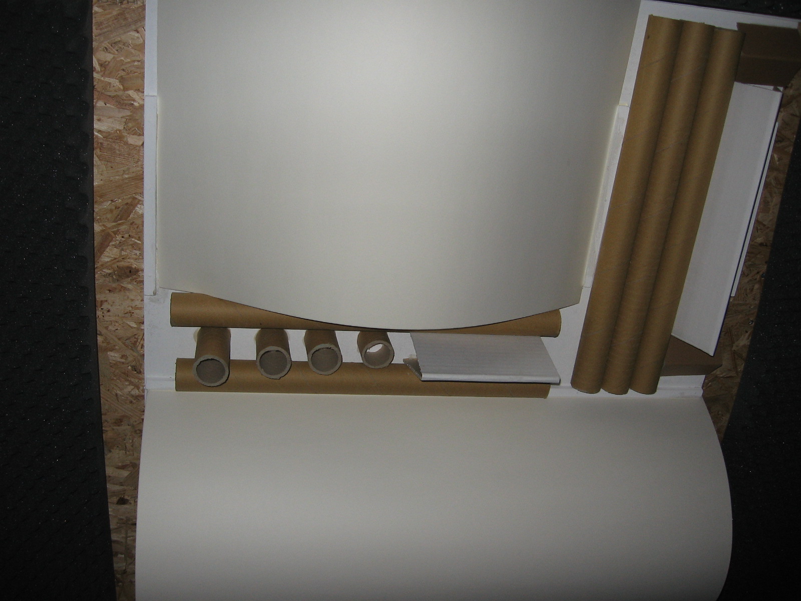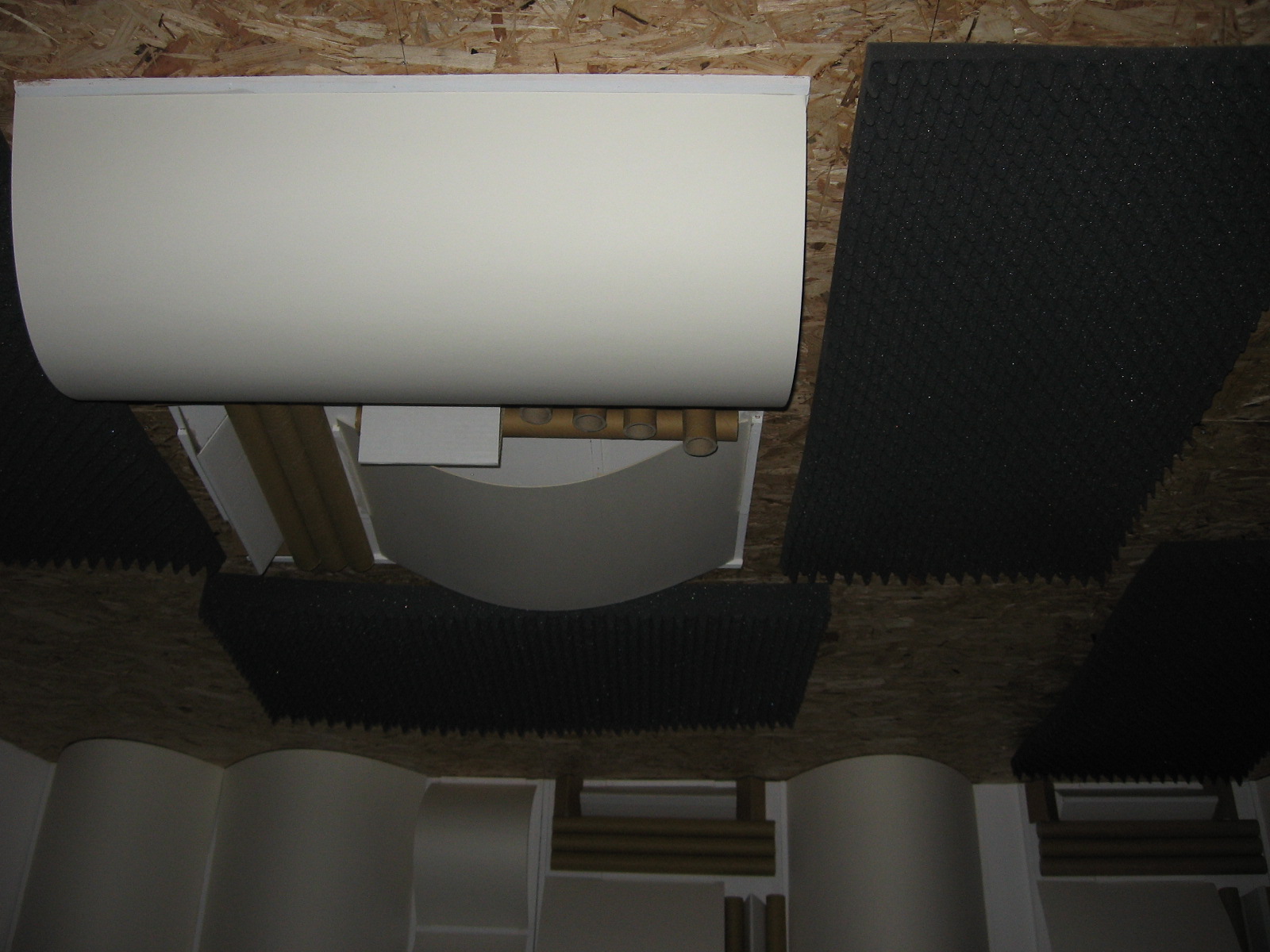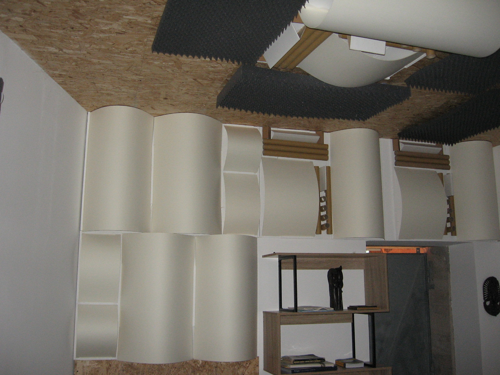 J'ai également fabriqué 6 grands panneaux diffuseurs avec ce qui me tombait sous la main (cylindres de carton, plaques de carton, cartons dits "de fond" pour les diffuseurs bombés, l'isorel de 3mm étant trop rigide et n'en ayant pas trouvé de moins épais. 4 d'entre eux couvrent la totalité du mur derrière l'auditeur, 2 autres ont été placés au plafond.