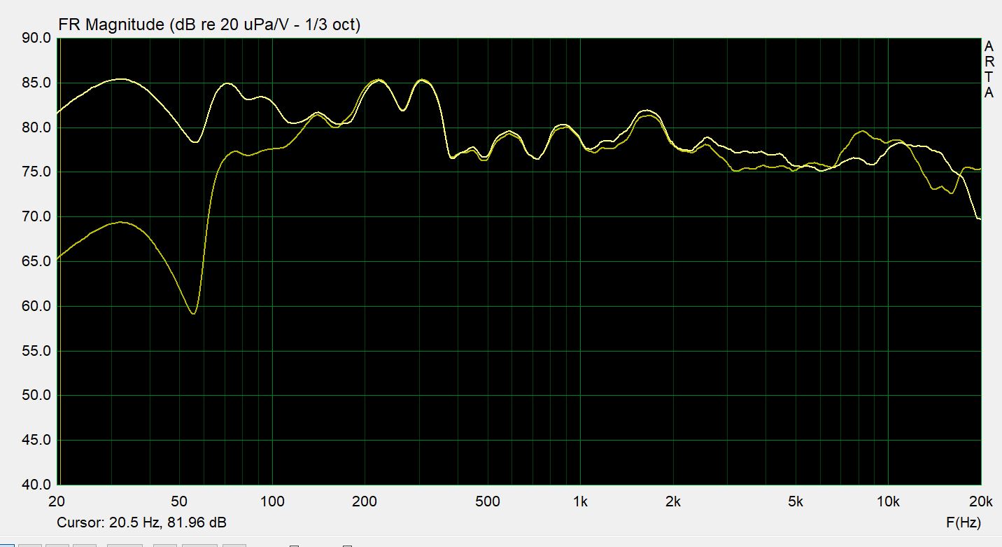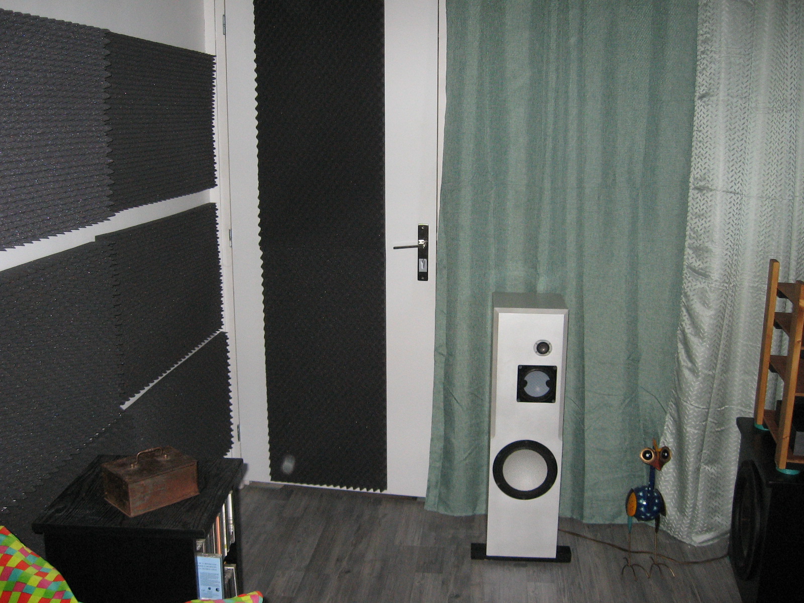 Les mesures: moyenne du RT60 réduite de 0.38s à pile 0.20s, qui était le but à atteindre! Pour ceux à qui ça parle: Micro et enceinte en position centrale hps vers le haut (position unique, pas une moyenne MMM), sweep long :