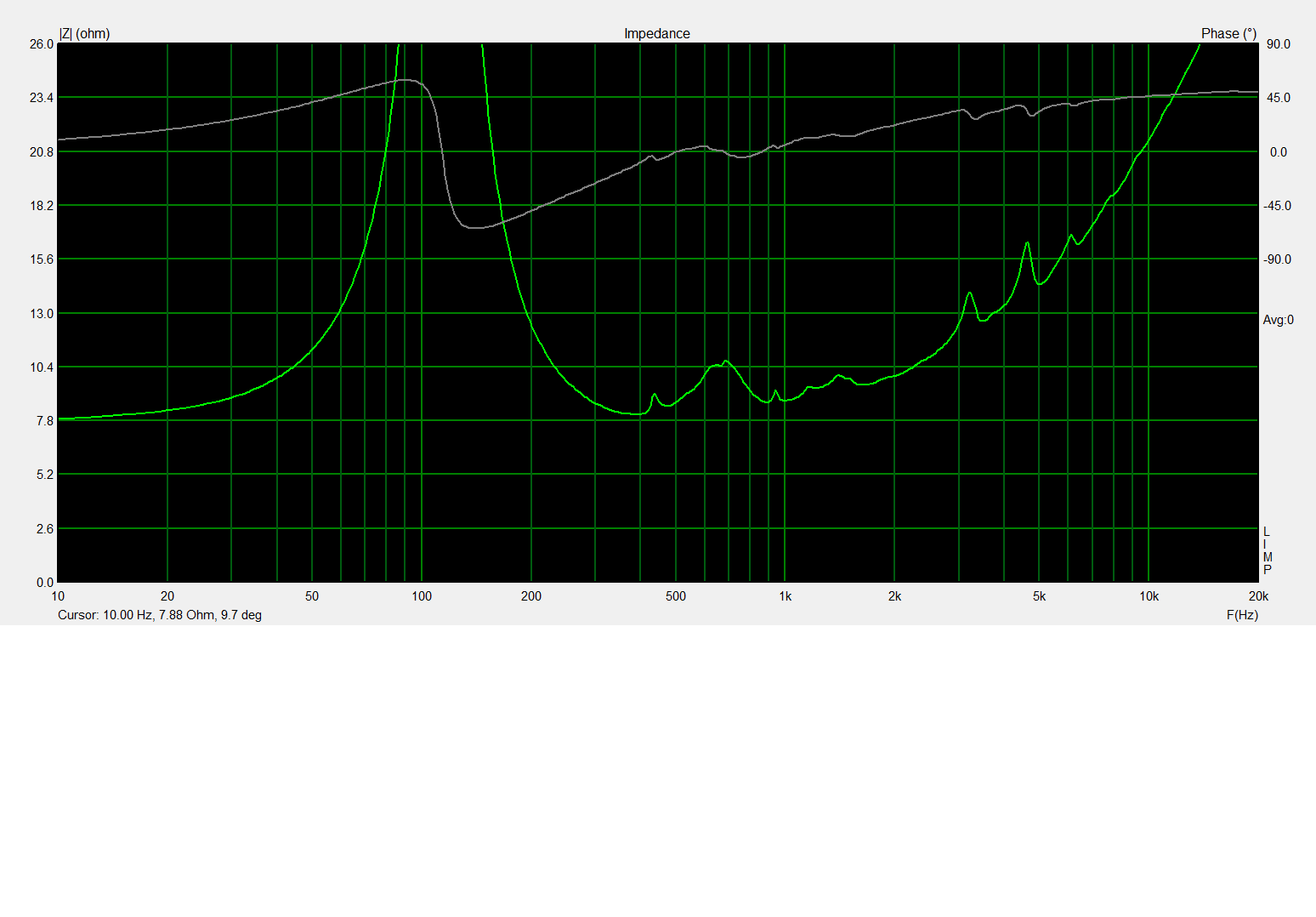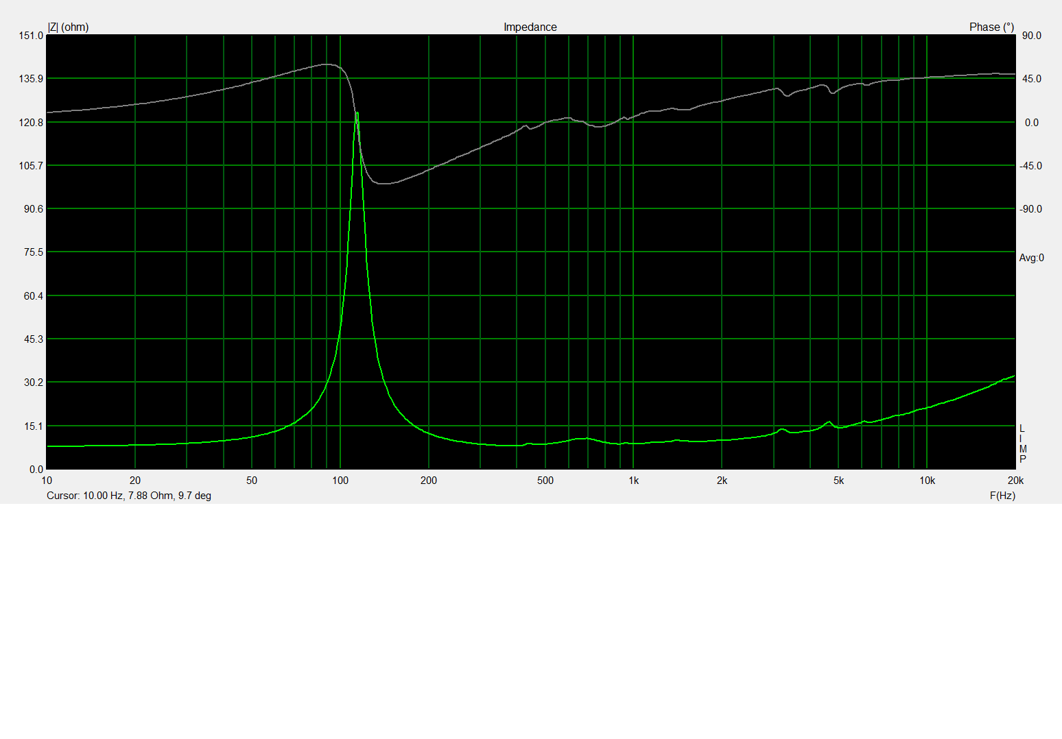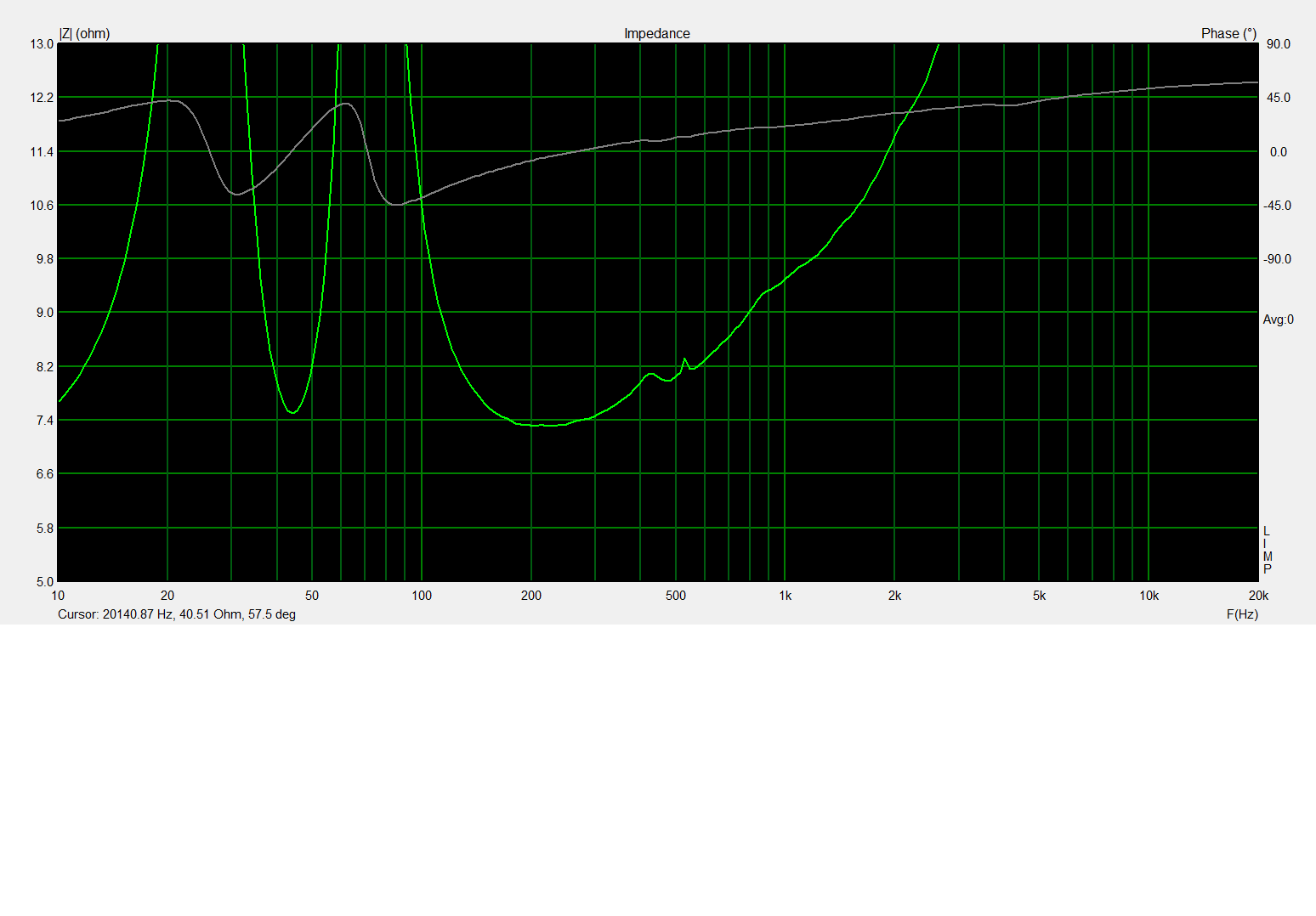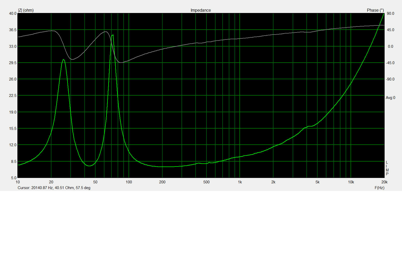 On commence par les mesures d'impédance des hps dans l'enceinte remplie aux 3/4 de dacron dans le volume des woofers et dans la totalité du volume du cox165. Hps rodés.