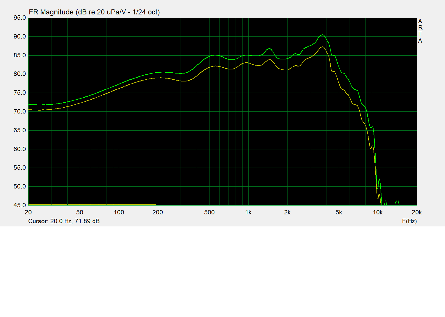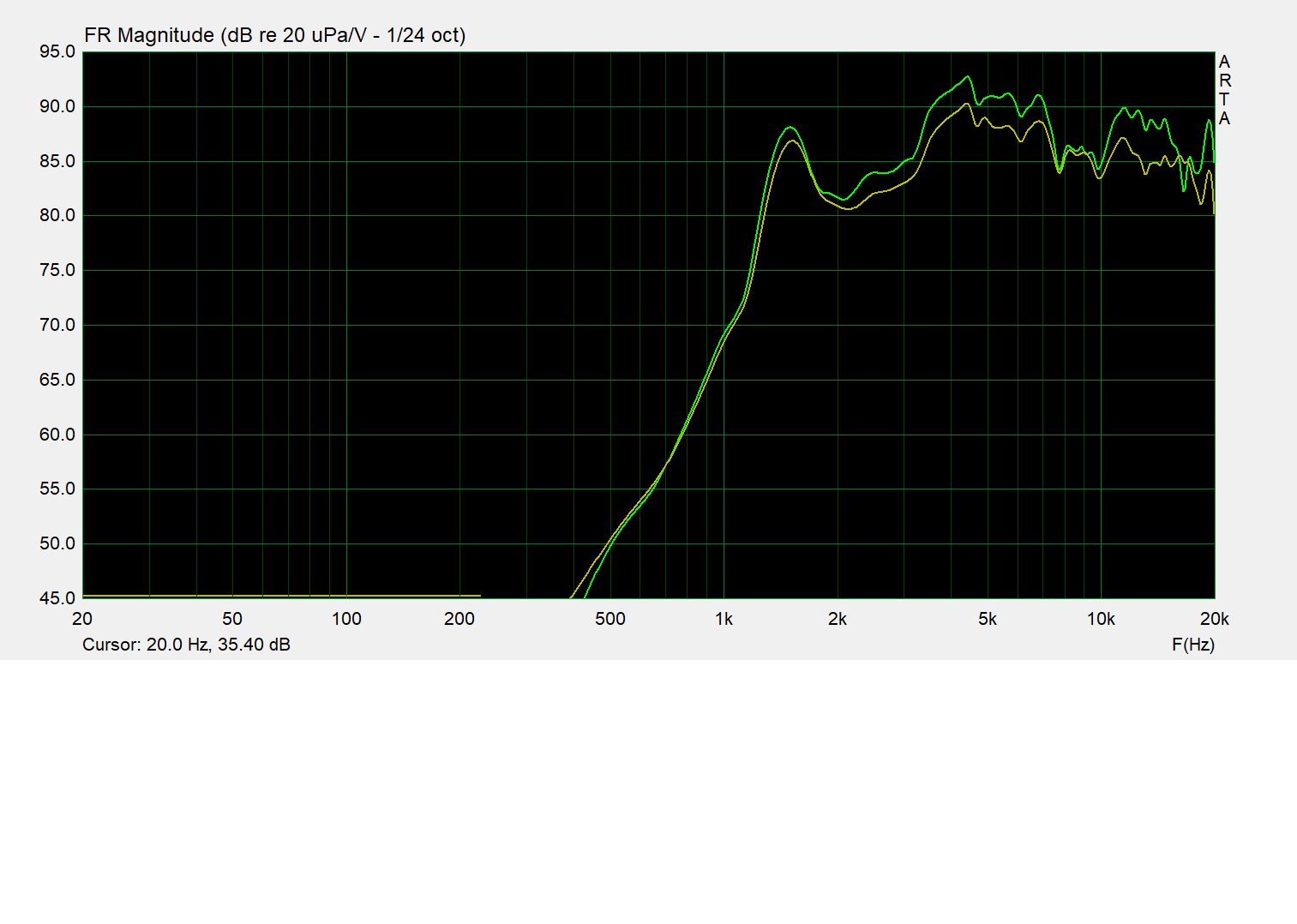 le mid: que l'accident entre 1 et 2kHz s'atténue légèrement en hors-axe et que l'ensemble de la courbe se linéarise quelque peu. Au regard des courbes du mid et du tweeter, il n'est pas étonnant que Kartesian ait choisi une Fx à 3.5kHz, évitant ainsi le trou du tweeter autour de 2kHz... alors même qu'ils préconisent une Fx à 2.8kHz en 12dB :D