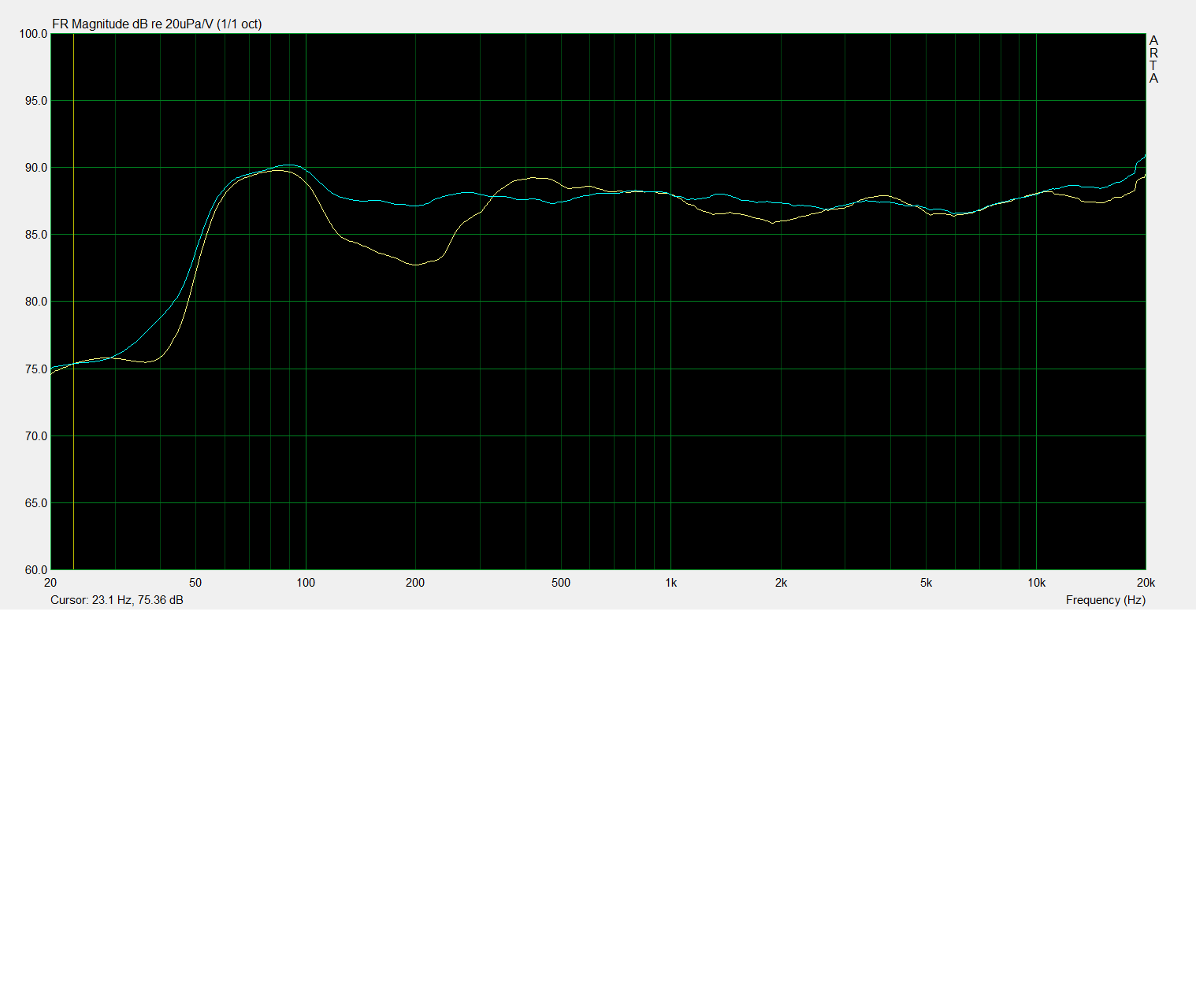 - les deux boomers réduisent le creux dû à l'effet de sol, mais pas assez à mon goût: j'ai boosté le 200Hz d'environ 2dB pour obtenir une écoute "en chair", visible sur la fonction de transfert
