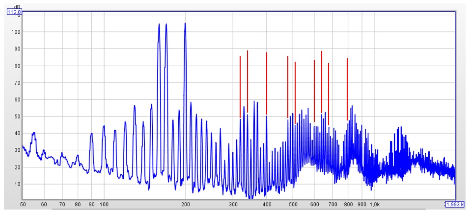 Lors d'essais sur la compression Nd2060A de 18 Sound, nous avons envoyé un signal à 4 raies localisées dans le tiers d'octave 8 kHz, à un niveau combiné de 120 dB à 1 m environ.