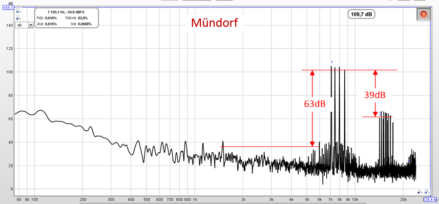 Ce relevé est celui d'un AMT Mündorf 197PP-27R. On observe un niveau d'intermodulation sans commune mesure avec celui de la compression évoquée plus haut, même en tenant compte de la différence de SPL.