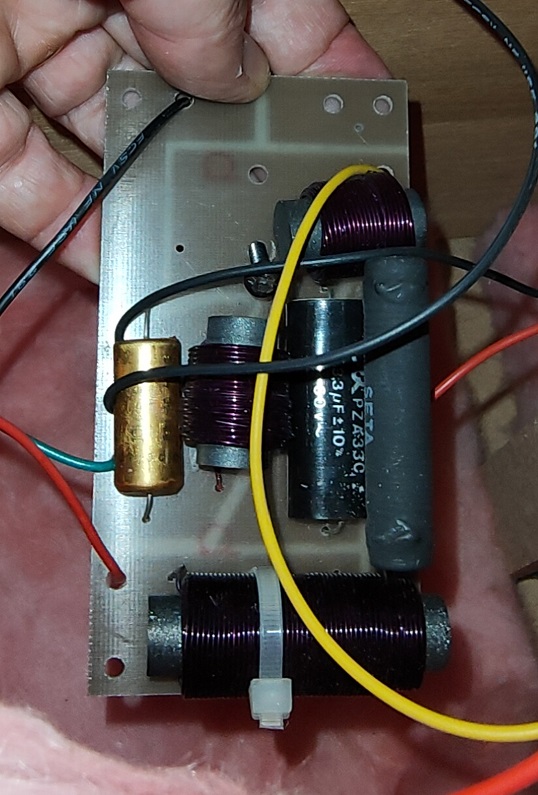 Le boomer 8C402DBE est un double bobine et celles-ci sont filtrées en 6db par 2 selfs sur ferrite (0.35mH et 2.6mH).