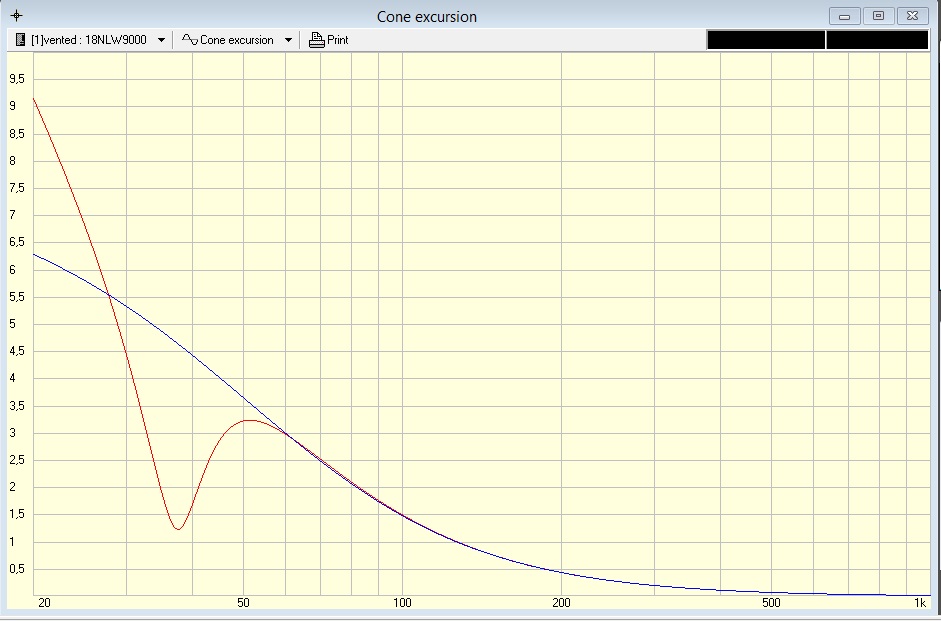 Dans cette configuration, l'excursion est trois fois plus importante en clos qu'en BR à 40 Hz.
