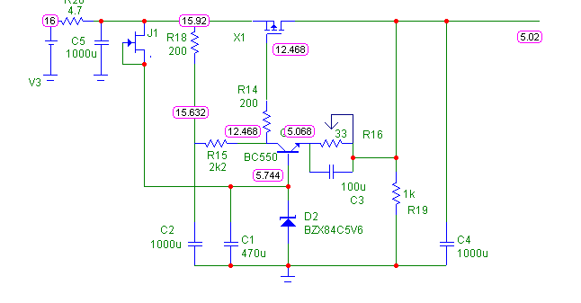 Par contre, je ne retiendrais pas ce montage pour faire un 7805 discret car dans le cas le cas d'un dropout de 3V (8V en entrée) ça ne passera pas ...