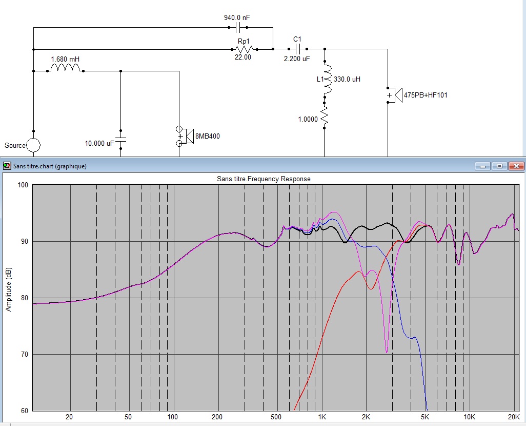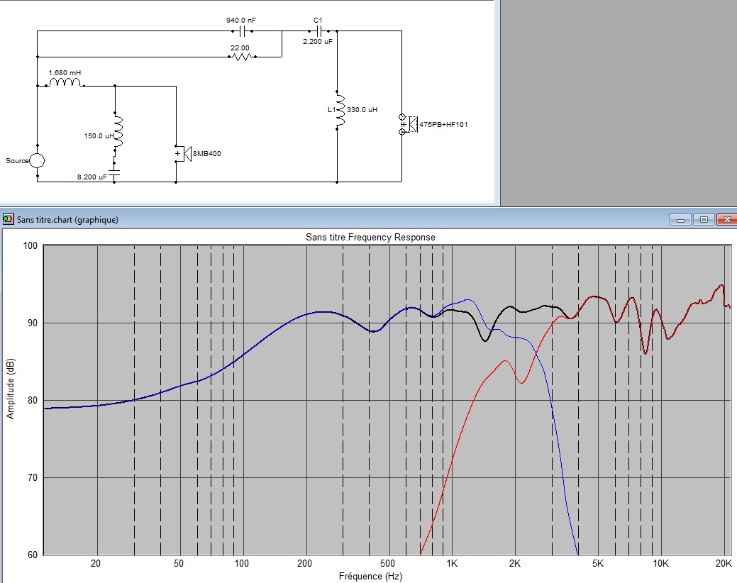 Par contre il n'est pas impossible que la perte hors axe >10khz requière une réponse compensante légèrement montante, et non plate comme avec un tweeter dôme traditionnel : à la simu on obtient qq chose de plat avec une légère coquetterie remontante... en ne mettant autant R d'atténuation !! Cette 0,82µf en série est magique : vive le filtrage passif
