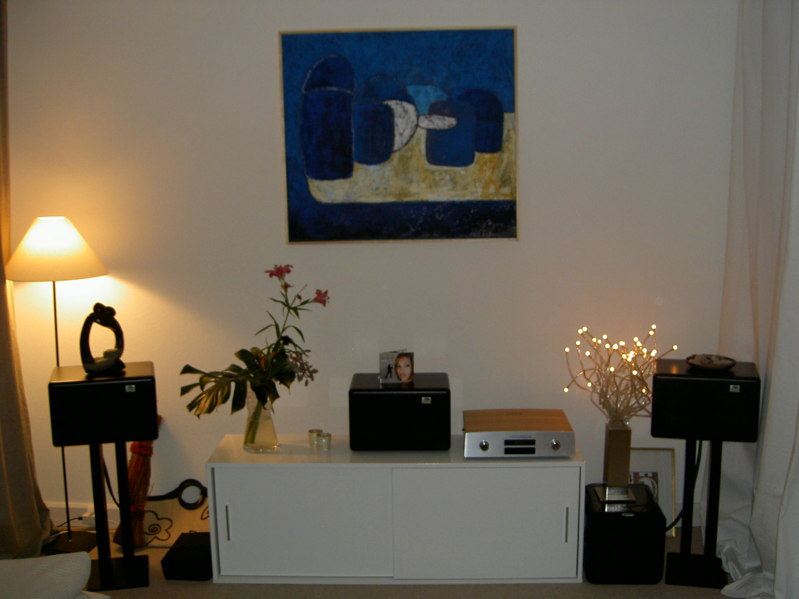 Devant mon mûr sont disposée mes enceintes MC26 sur des pieds et mon éléctronique dans un meuble Ikea modifié.