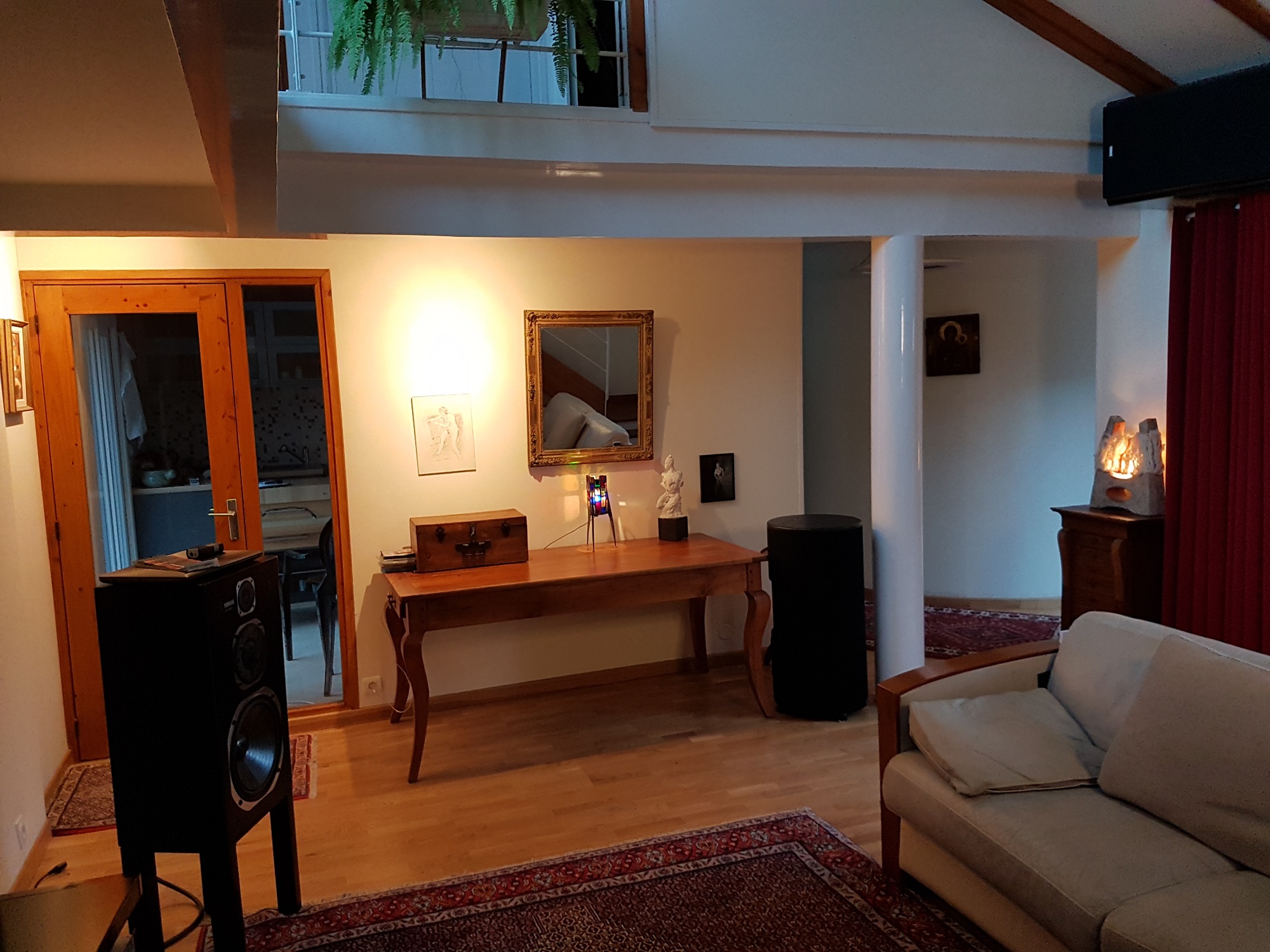 Dans cette pièce, on peut donc avoir facilement une solution de placement équilatérale avec le point d’ecoute à 2,5 m du plan des enceintes des enceintes, ce qui laisse de la place derrière et sur le côté des enceintes. Le facteur d’amortissement n’est pas très fort, mais je peux envisager un traitement acoustique passif du moment qu’il est raisonnable en faisabilité et prix.