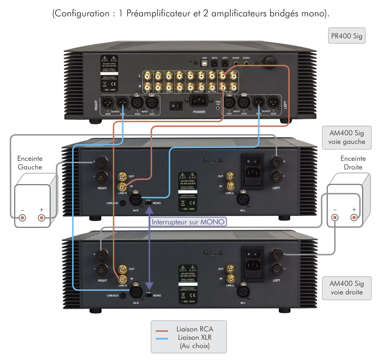 Chaque AM400 ayant alors suffisamment de réserve pour conduire uniquement le HP de graves de sa Scala... Le préamplificateur disposant d'une double sorties XLR L/R, il pourrait alimenter deux amplificateurs de puissance mono de faible puissance dédiés uniquement aux mediums/aigus...