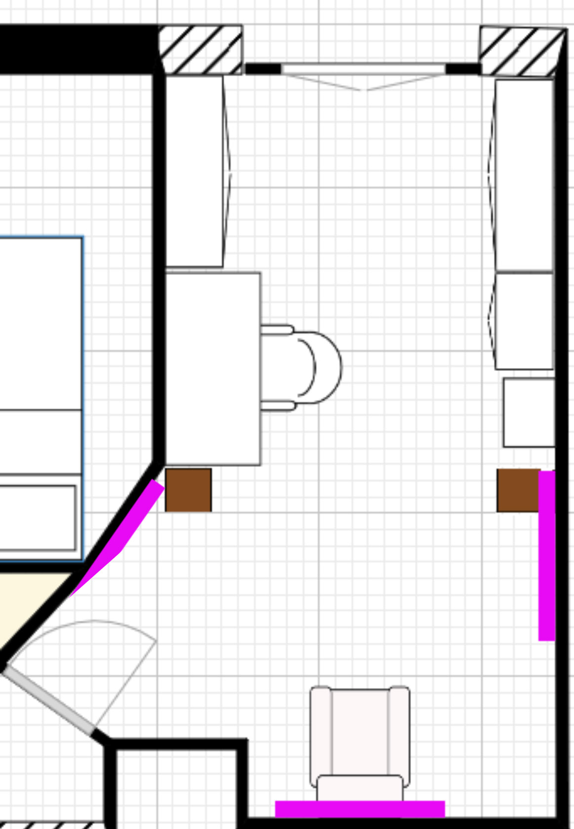 Tu pourrais placer une des Ikea à l'ouest, le bureau dos à la fenêtre, mettre des rideaux si il n'y ne a pas, les colonnes au sud.