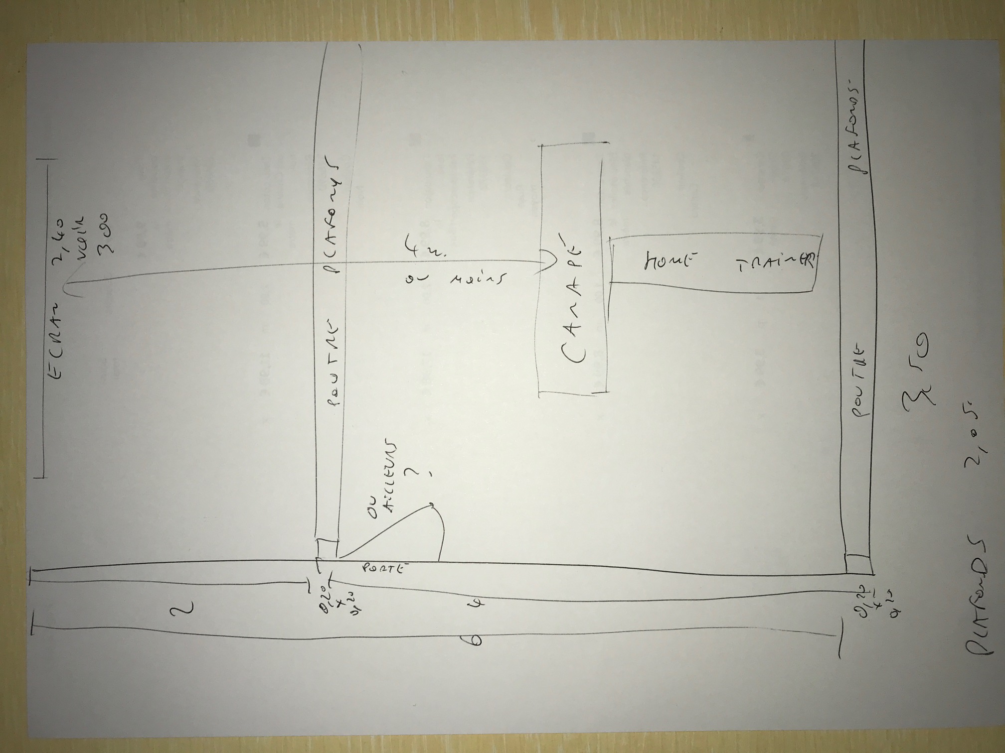 Si tu prends la 3.8m pour le multi-media, on peut faire un écran de 2.2m de base et un recul de 3.2m ça donne un angle de vu de 38°. En ratio de projection, avec une distance de 3.0m ça donne un VP à 1.36 qui est possible de trouver sur le marché. Dans l’autre sens si tu installes ton vélo, il semble mieux de mettre un grande télé sur le mur. Sinon, pourquoi pas mettre les roulettes sous le vélo et sous le canapé et rester avec une seule système?
