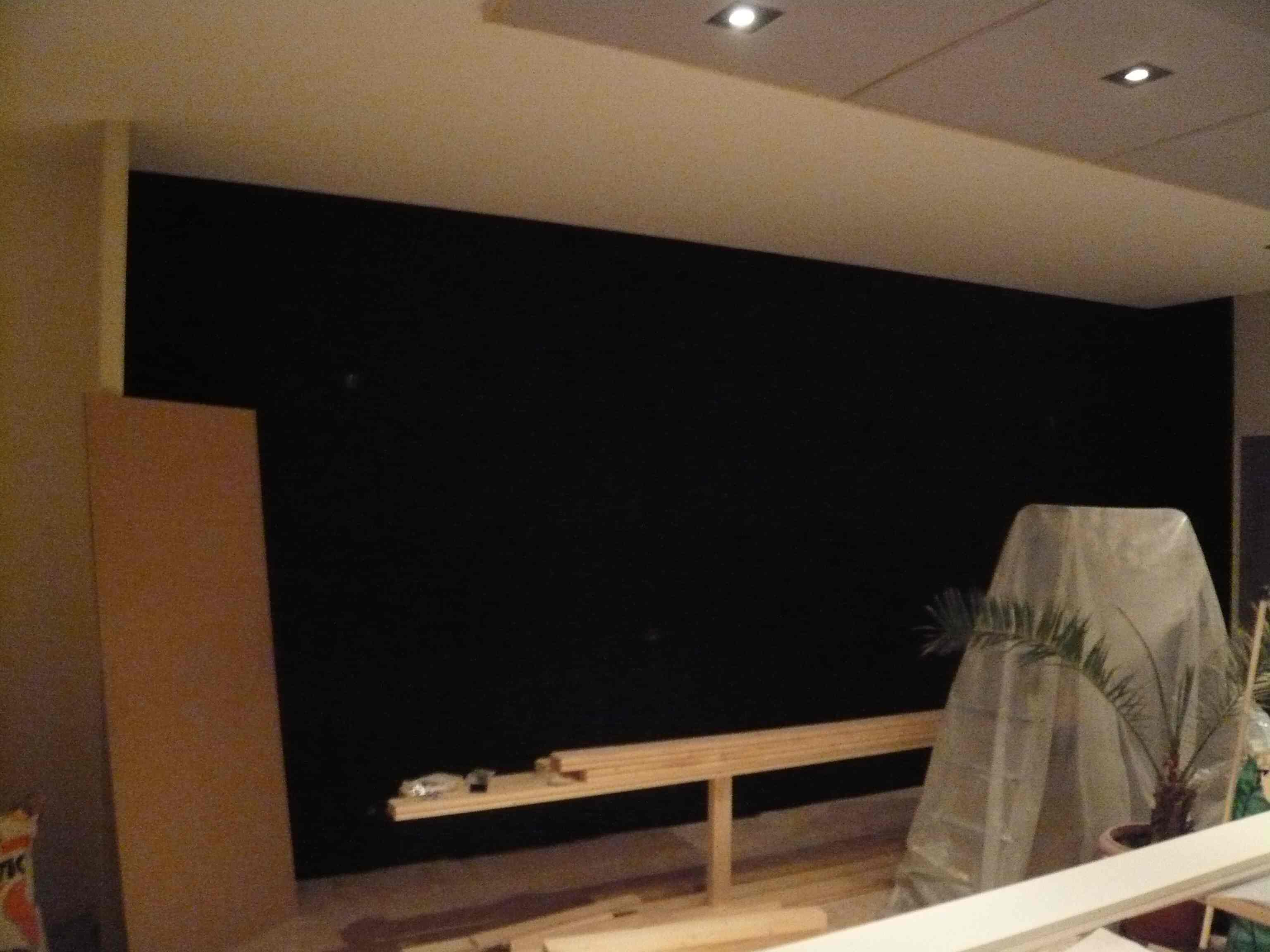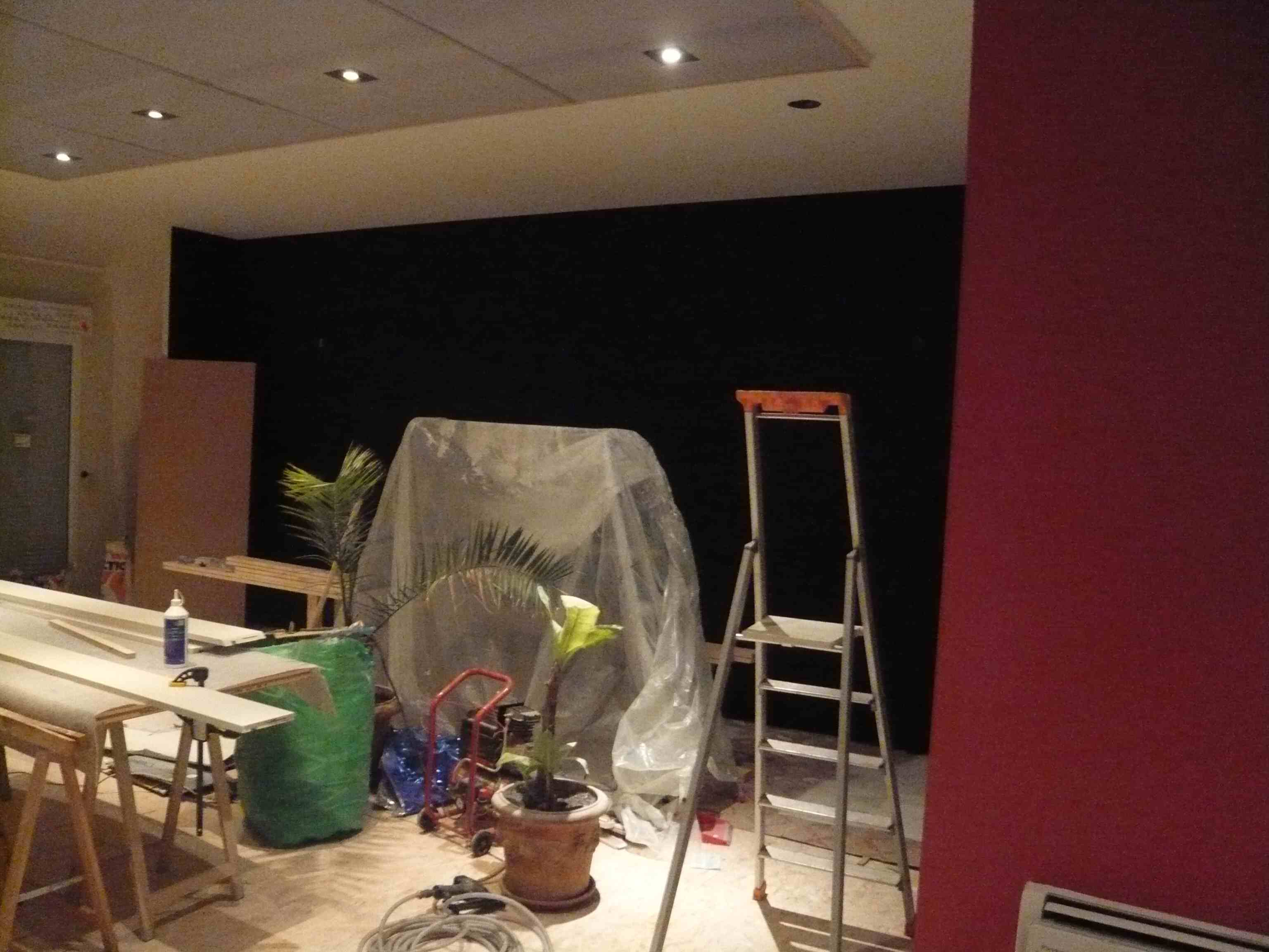 toute la zone technique derrière l'écran a été peinte en noir pour limité les problèmes de transparence du tissu acoustique