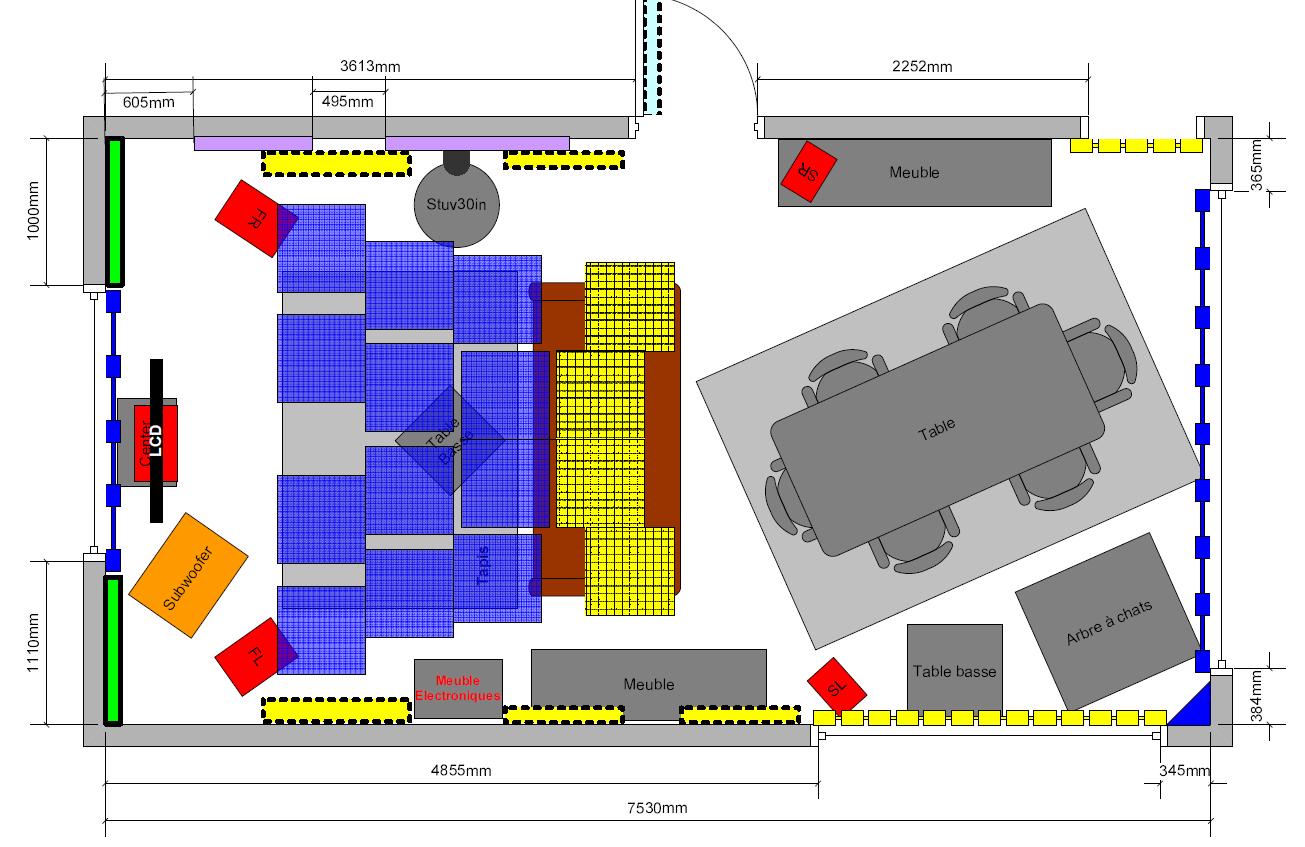 Pour légender: les carrés bleus sont des dalles en mousse de 100m d'épaisseur, les carrés jaunes des diffuseurs 3D, les rectangles jaunes cerclés en pointillés sur les murs latéraux sont des diffuseurs 2D (ceux les plus proches des enceintes correspondent aux premières réflexions, à affiner niveau positionnement j'ai fait le coup du miroir mais je dois délimiter les zones plus précisément), les créneaux bleus devant les fenêtres sont des rideaux triple épaisseur (velours - molleton - velours) qui vont de bas en haut, les créneaux jaune devant une fenêtre et une ouverture sont des stores verticaux non absorbants.