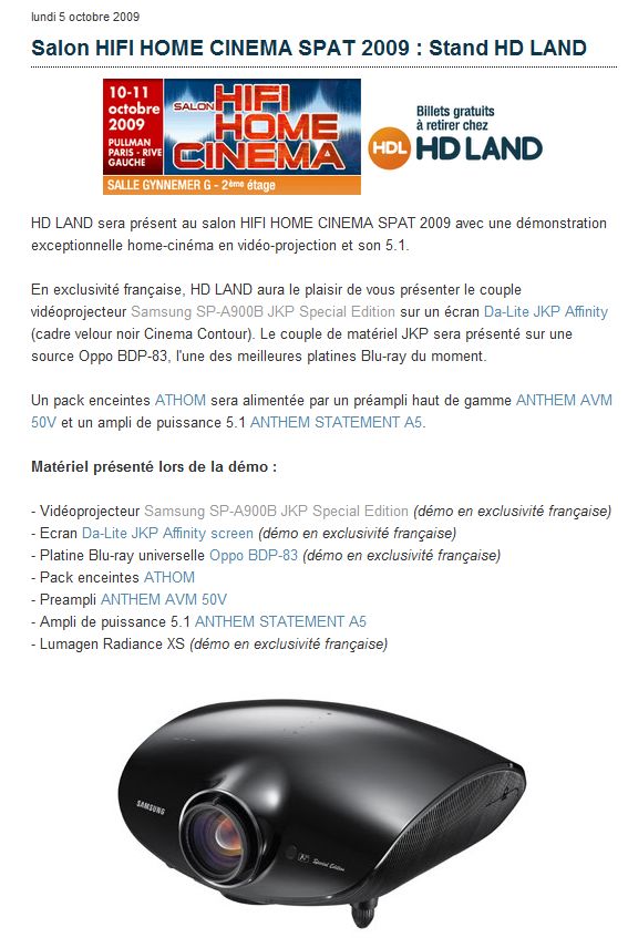 En démo lors du Salon HIFI HOME CINEMA SPAT 2009 du 10/11 octobre 2009 : Stand HD LAND
