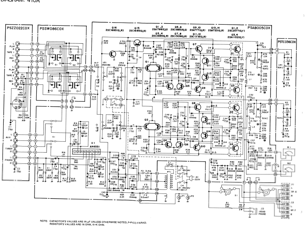 Ebay présente des 10000uF/63V Elna dont la capacité pourrait convenir en remplacement des 6800uF 45V. Je pense que ces condensateurs sont faciles à trouver. Il faut vérifier absolument si l'écartement des broches et la taille des condensateurs permet le remplacement sans modification. Il ne serait pas correct de monter les capas de filtrage avec un câblage en l'air. Le service manual 430a 410a se trouve chez elektrotanya.com