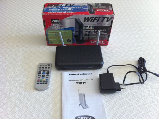 Transmetteur audio video via wifi, utilise un serveur type XBMC pour s'alimenter en fichier. Fonctionne pour la video et/ou le son (idéale pour alimenter une petite chaine hifi à distance). connexion via Wifi (criptage WPA) ou cable réseau, dispose d'une sortie optique pour le son.