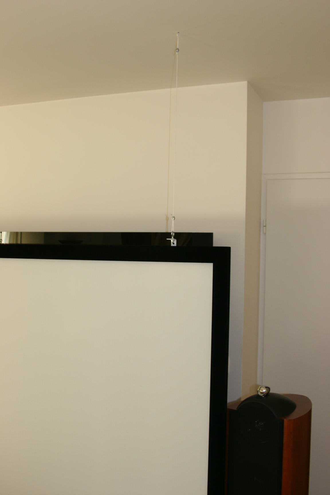 Pour la fixation de l'écran, j'ai fixé 2 crochets blanc au plafond puis avec des élingues (cable + serre cable), j'ai ajusté la hauteur de l'écran.