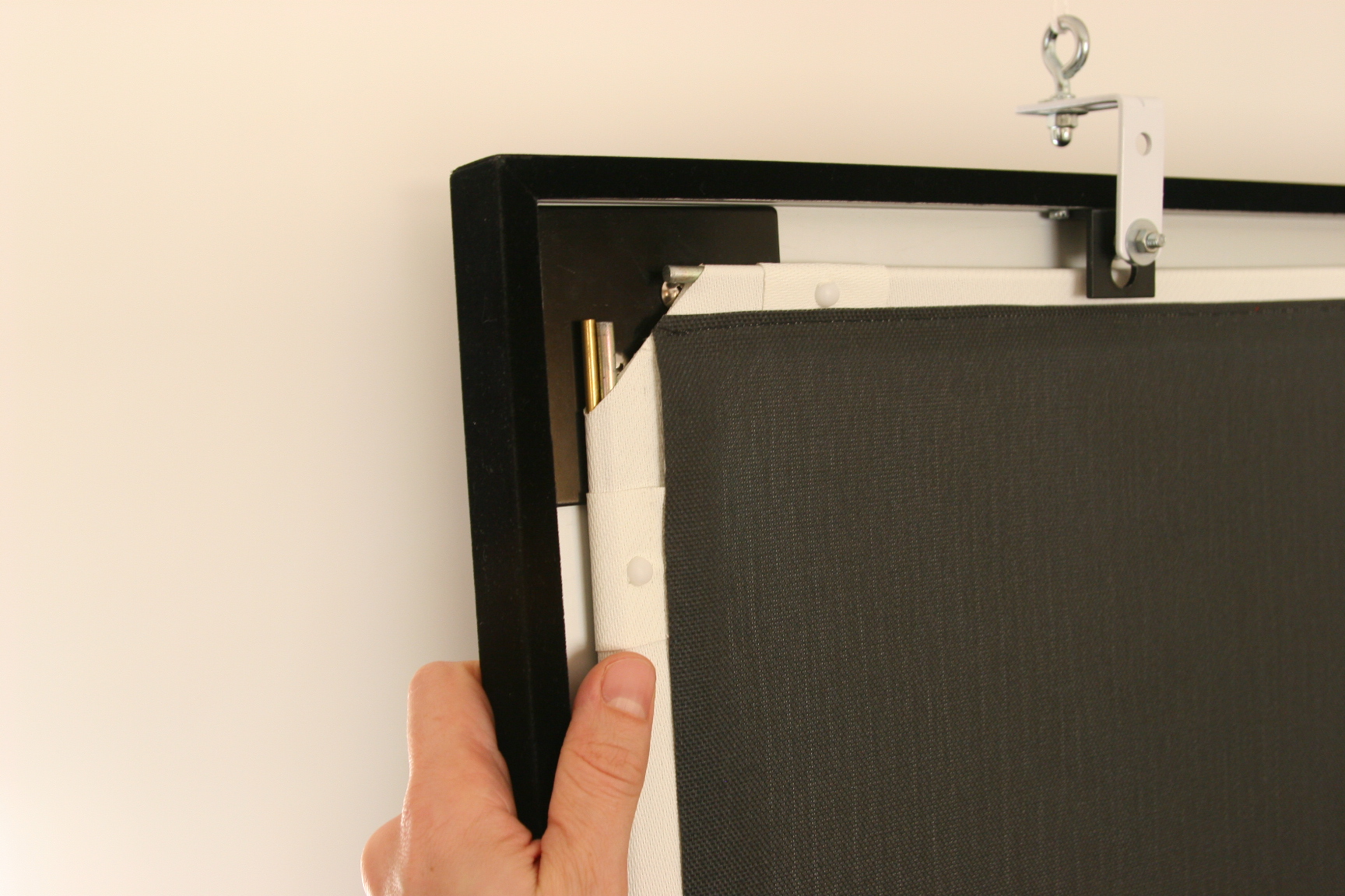 C'est encore plus vrai lorsque l'on souhaite une bonne planéité de la toile (donc tensionné), des bandes noires sur la toile de projection et un dos noir vu que l'arrière de l'écran ne peut être traité contre les réflexions parasites.