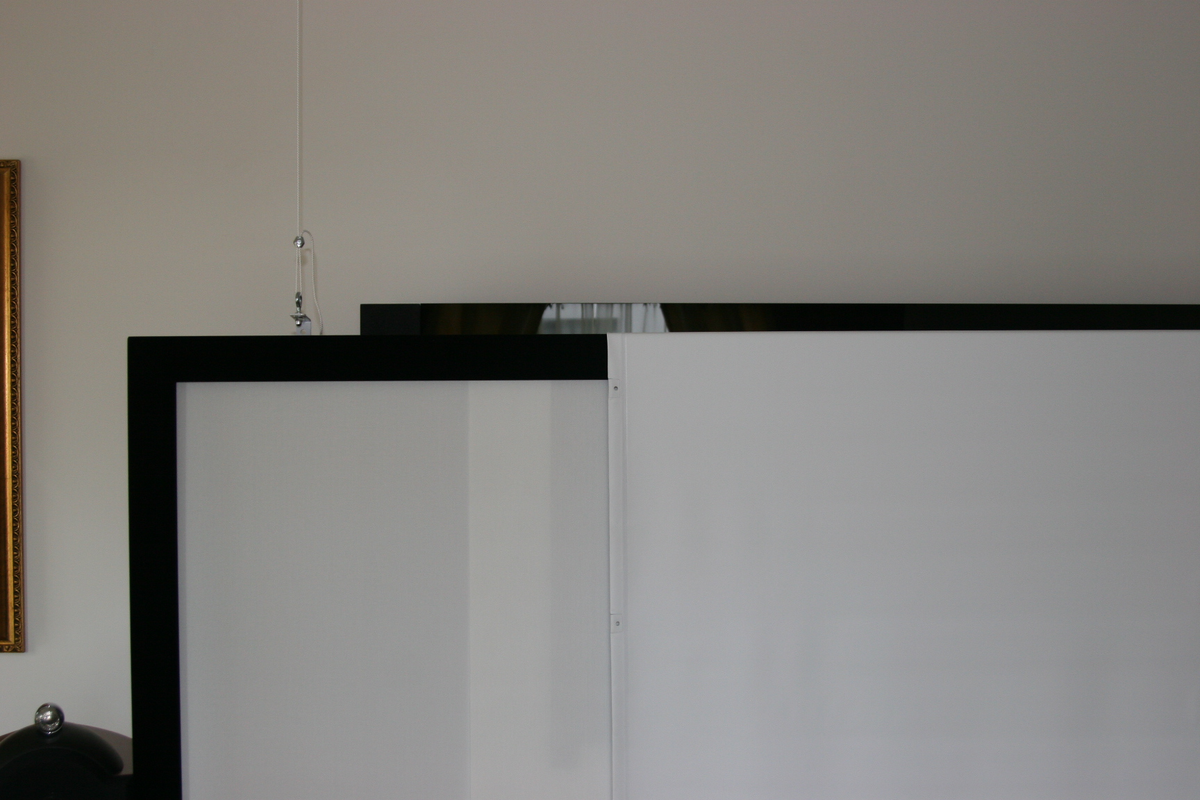 Le fond noir gondolait ce qui en soit n'est pas dramatique mais je craignais que les différences d'écartement entre les toiles ne provoquent des différences d'intensité de lumière à l'image. Vous verrez par la suite que le gain de la toile blanche change selon ce qui se trouve derrière ...