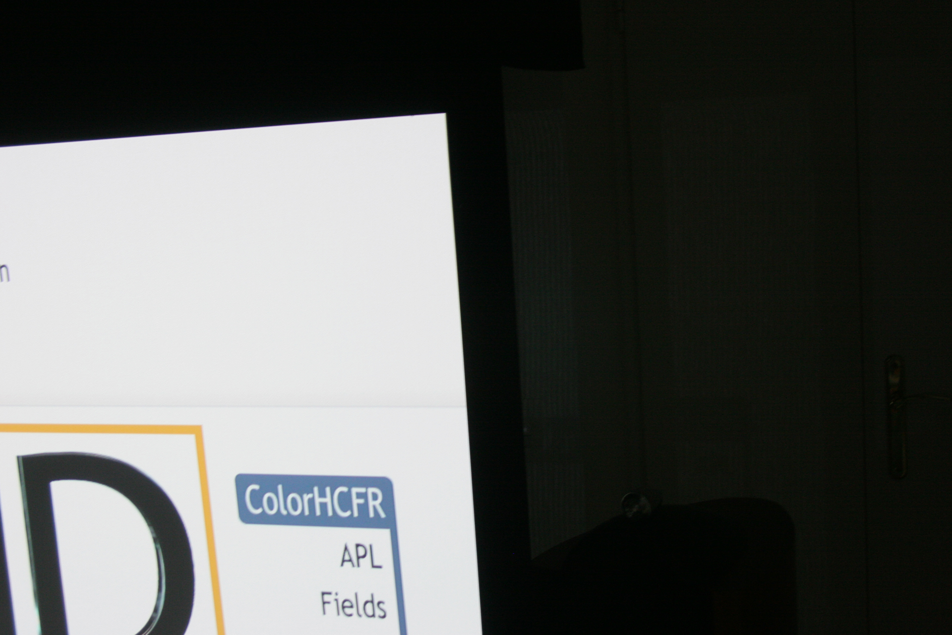 Paradoxalement, à ma distance de visionnage (2.90m) et sous la lumière ambiante, la toile est bien uniforme mais en condition de projection, la trame devient décelable dans un cas bien particulier : si une portion de l’image comporte un fond uni, assez important en superficie, lumineux et qu’un traveling de caméra à lieu.