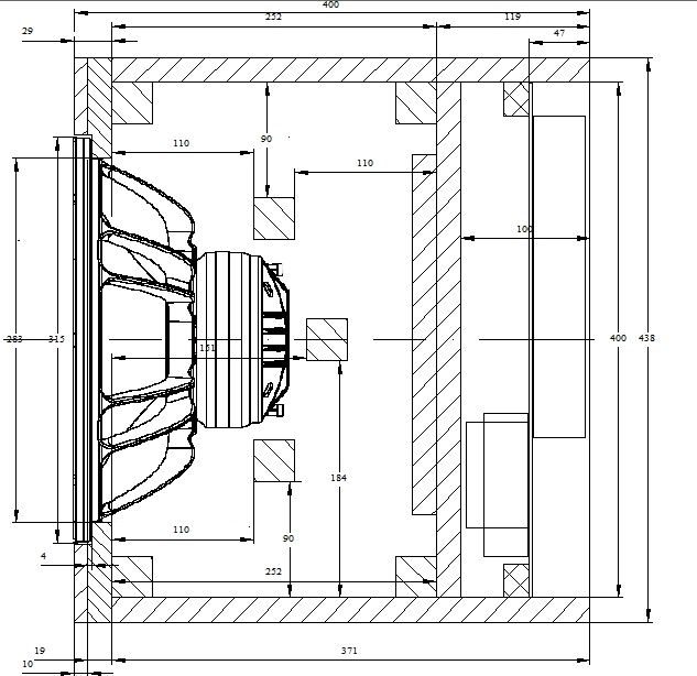 Pour le volume interne net de la caisse, je n'ai pas trouvé de valeur en page 1 : 20 litres ? Je suppose que ça n'influe que sur la puissance de l'ampli et la tenue en puissance du système. Par ailleurs, tu dis Philippe que l'effet de baffle n'a pas été pris en compte, je peux donc modifier les cotes de la face avant pour les faire plus hautes et un peu moins larges ? Par exemple 34/35cm de large sur 50/60cm de haut ?
