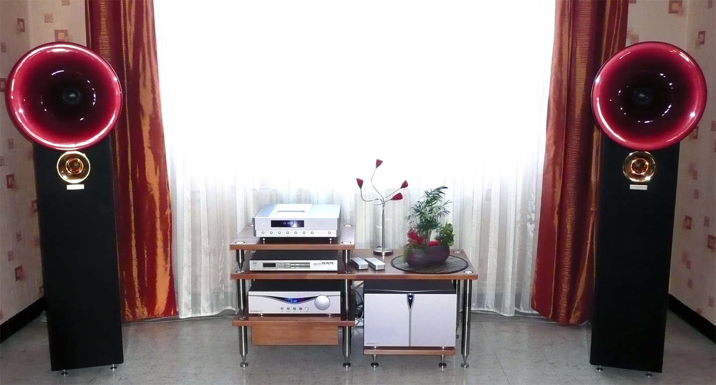 –– une paire d'enceintes [audio physic] CLASSIC 20, 3 voies à 3 haut-parleurs, à la reproduction étendue, conciliante dans son placement (émission du grave par une ouverture au fond de l'enceinte) et dans son association. Qui plus est, elle bénéficie d'une large variété de finitions allant des classiques finitions bois satinées aux finitions verre blanc, noir ou coloré (moyennant petit supplément ; photo)