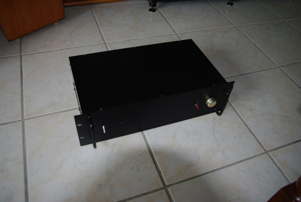 Ampli avec filtre actif : Façade alu noire 48 cm de large x 13,5 cm de haut . Boîtier 44 x 25,5 x 12 cm environ