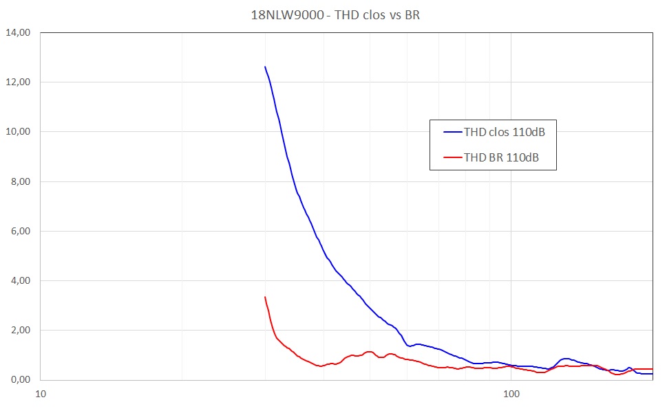 Ci-dessous, la superposition des THD des deux configurations, pour un même SPL normalisé de 110 dB à 1 mètre :