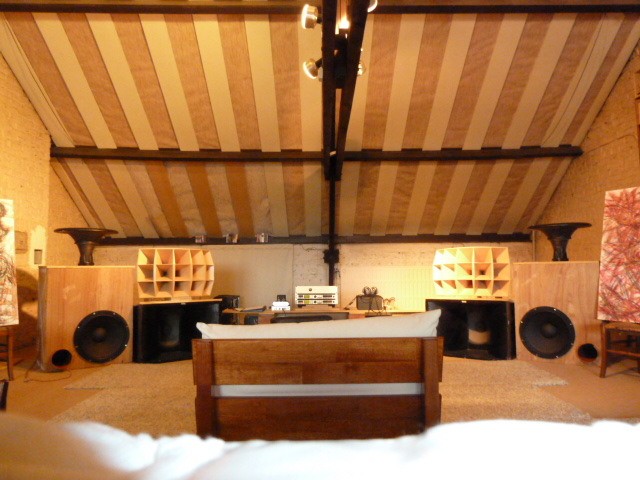 Cette installation serait donc le meilleur exemple qui soit de ce que doit être un positionnement dans la pièce, loin des cloisons, avec la chance inouïe d’un volume global énorme qui évite des modes stationnaires, que ne nous entendons pas ou peu, la pièce étant probablement, de par ses dimensions, en dehors d’un régime modal établis, car elle se trouve déjà au-dessus de la fréquence de Schroeder.