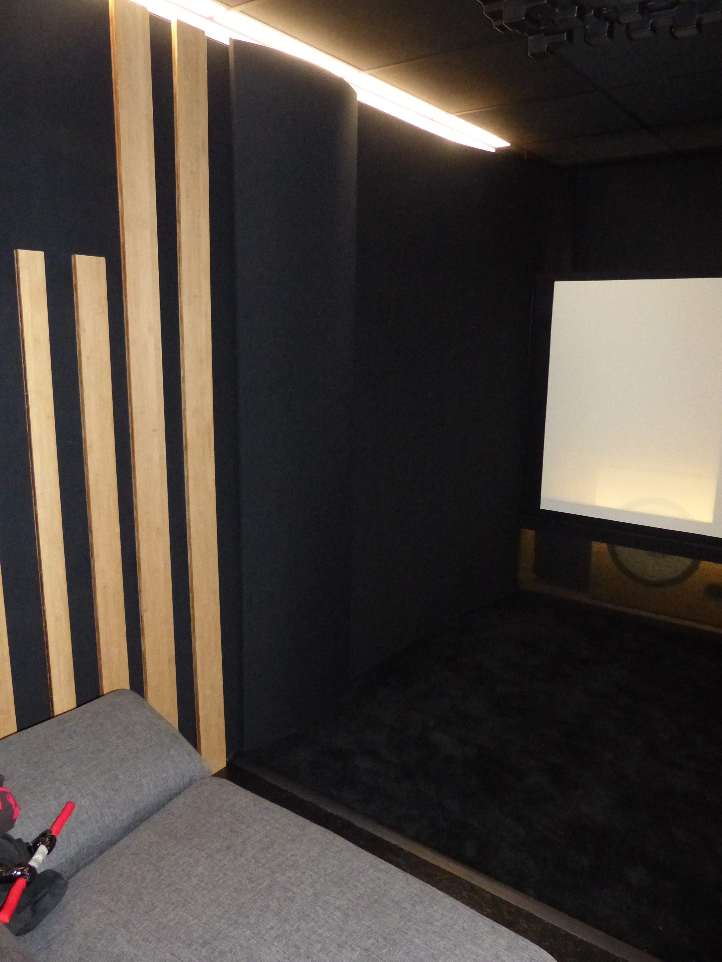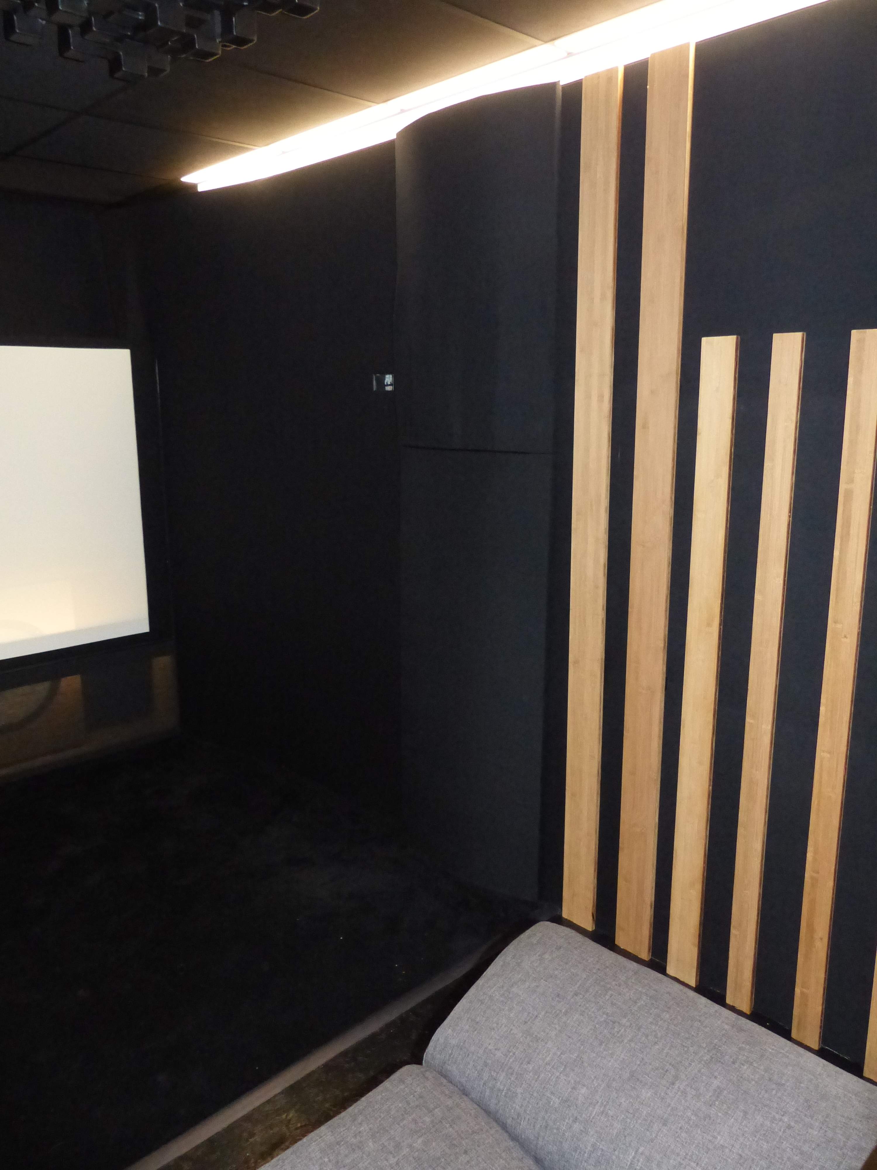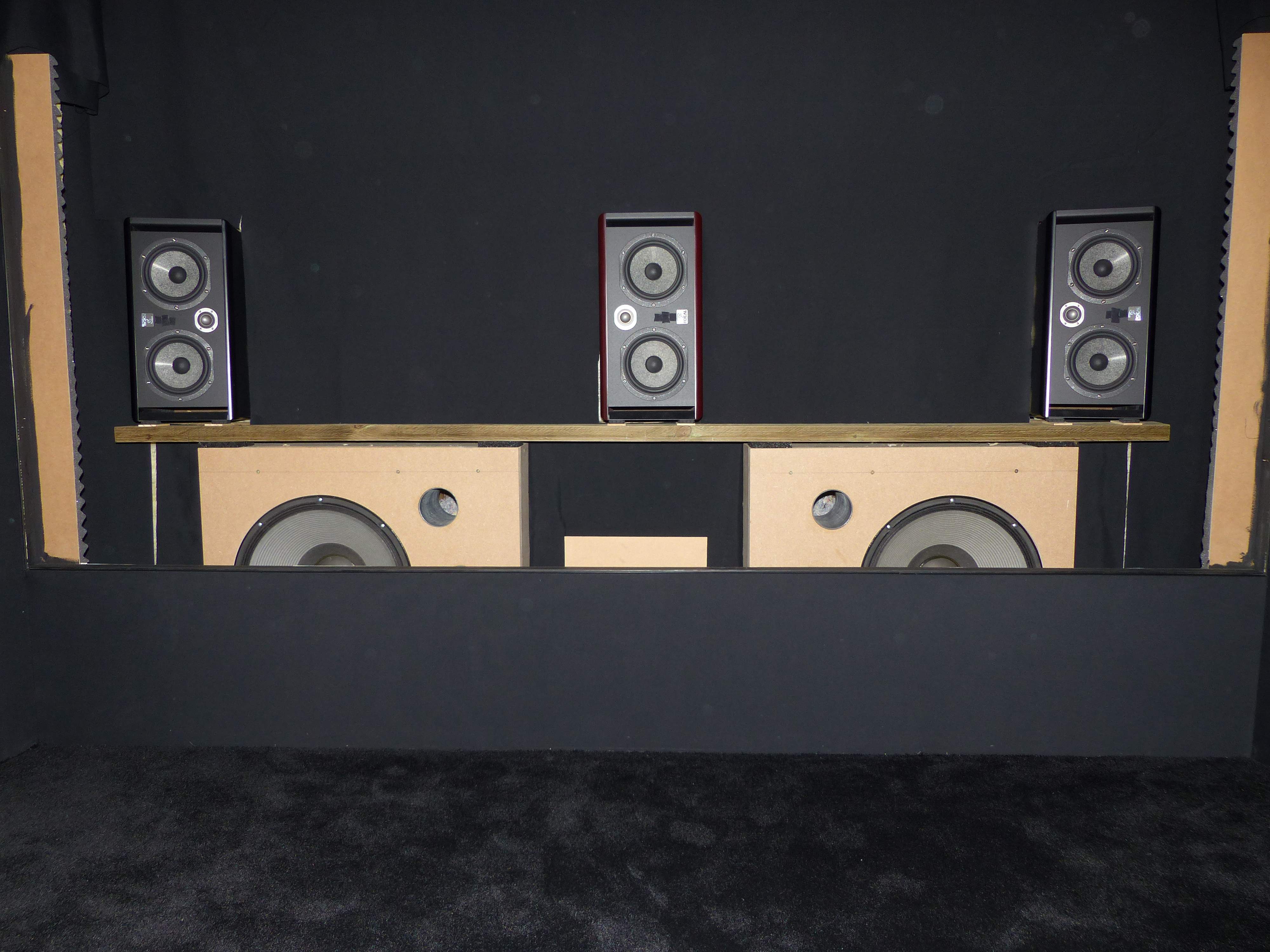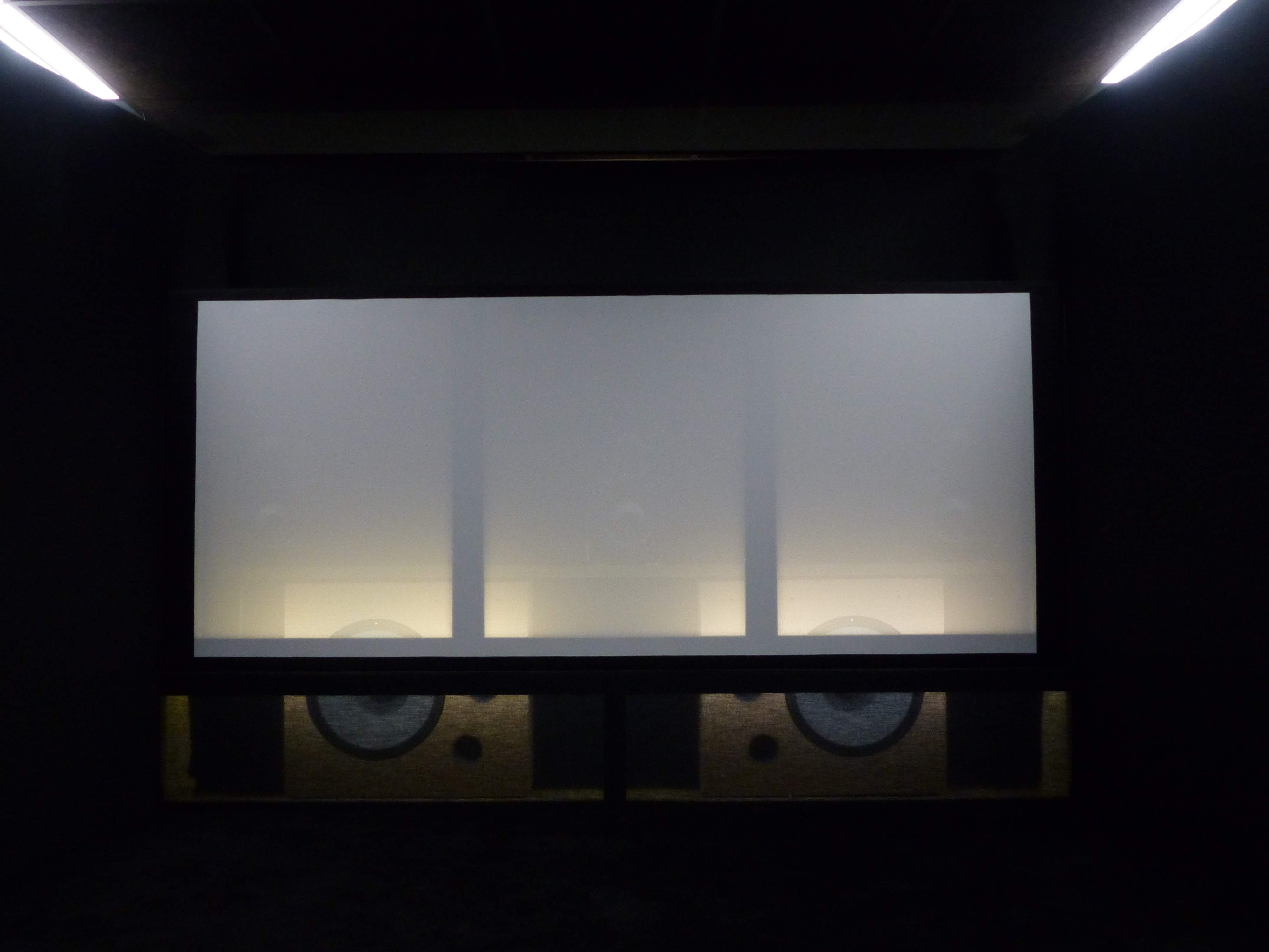 Des photos de la scène frontale. Avec l'éclairage allumé.Sans éclairage (un écran et rien d'autre pour distraire durant un film).Pour ceux qui suivent, j'ai ajouté du tissus autour des enceintes pour absorber toute la lumière qui passe au travers de l'écran.Un gros plan sur une enceinte qui permet des voir les divers traitements et le découplage (j'ai remplacé les pointes par des patins Stabren).