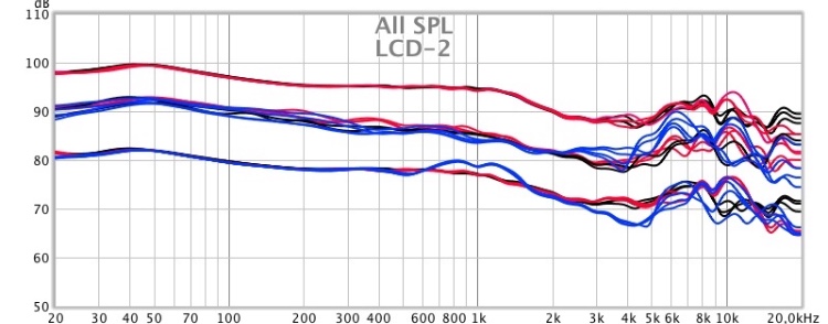 Les courbes du bas: en bleu mon lcd-2 sans eq avec la bosse vers 1khz et le manque a 4khz (rappel, le grave est toujours corrigé sur toutes les courbes) . En rouge et noir les 2 canaux egalisés pour un son neutre a mes oreilles