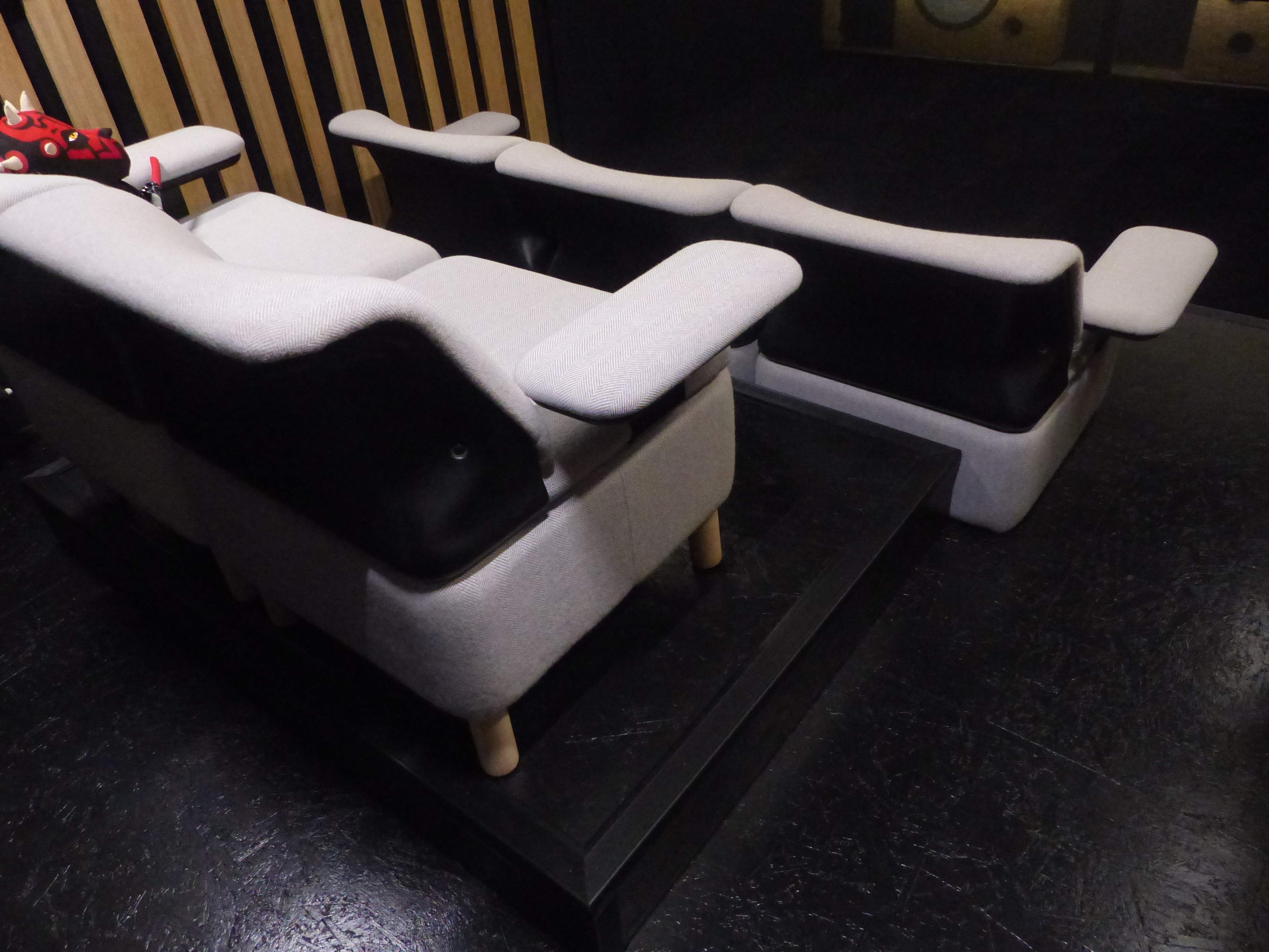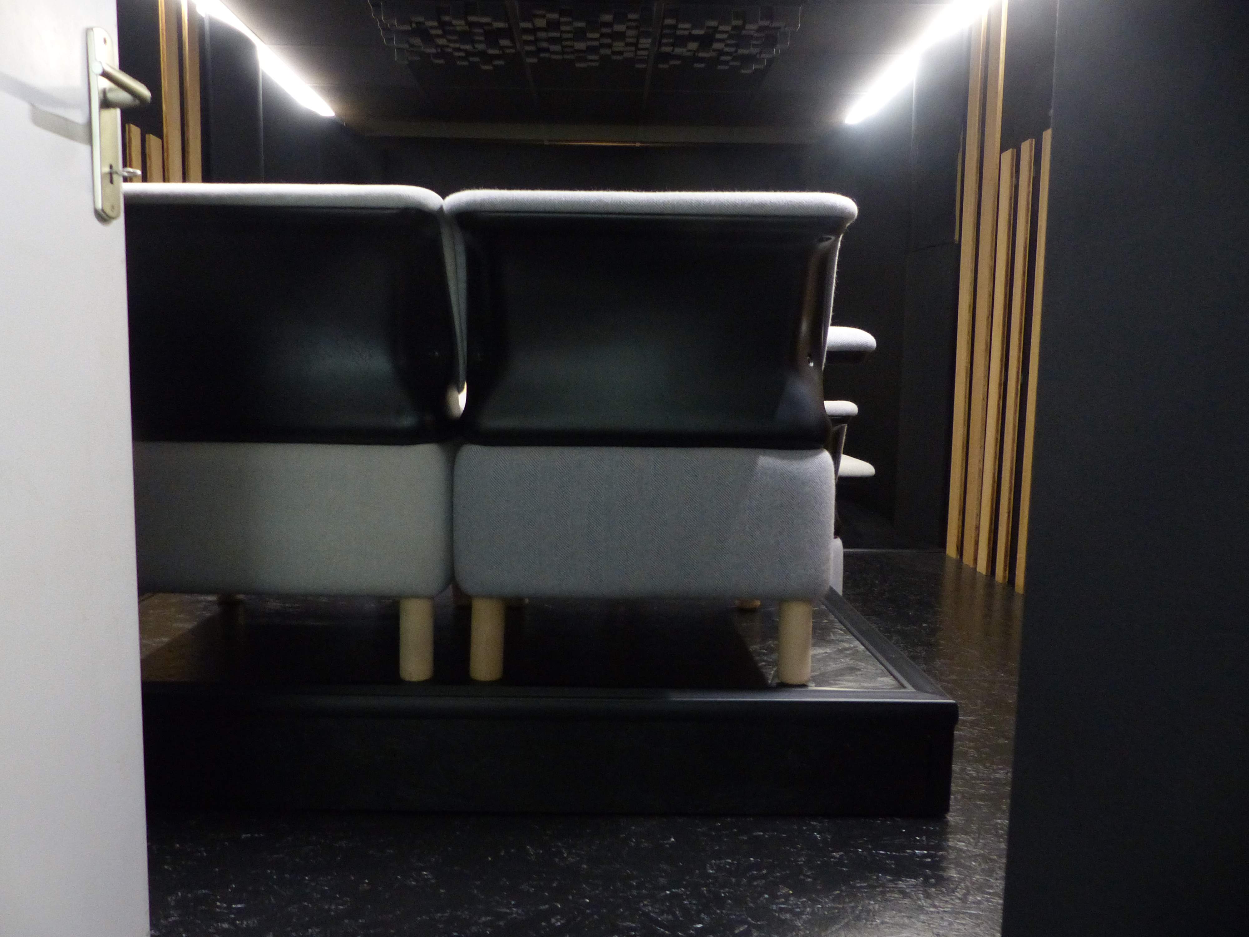 Une vraie évolution qui ne m'a pas coûté grand chose : Ma boîte fait des travaux et les fauteuils modulables qui étaient à l'accueil partaient à la benne. J'ai récupéré ces fauteuils qui, bien qu'assez vieux, n'avaient que peu servi. J'ai enlevé les pieds pour les 3 à l'avant. J'ai ajouté des pieds plus haut pour les deux à l'arrière et j'ai surtout fait une estrade pour obtenir une hauteur suffisante. Le résultat final me plait bien.