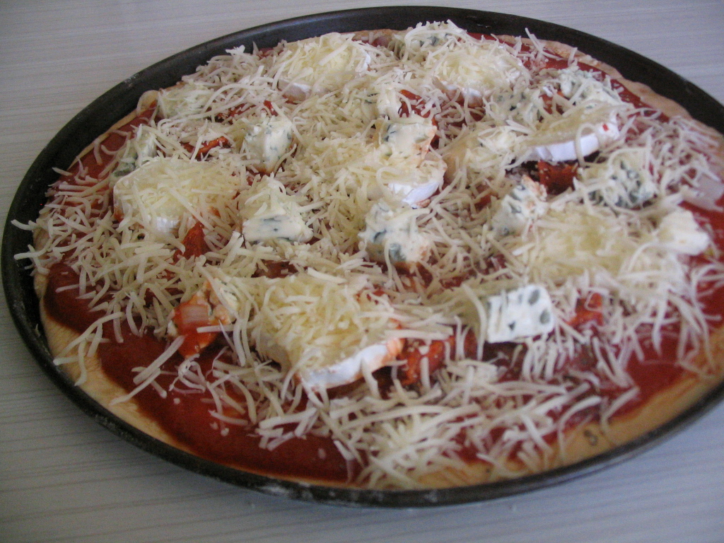 Sauce tomate,origan,échalotes,chorizo,fromage de chèvre,fourme d'Ambert,emmental rapé,parfois du Reblochon....