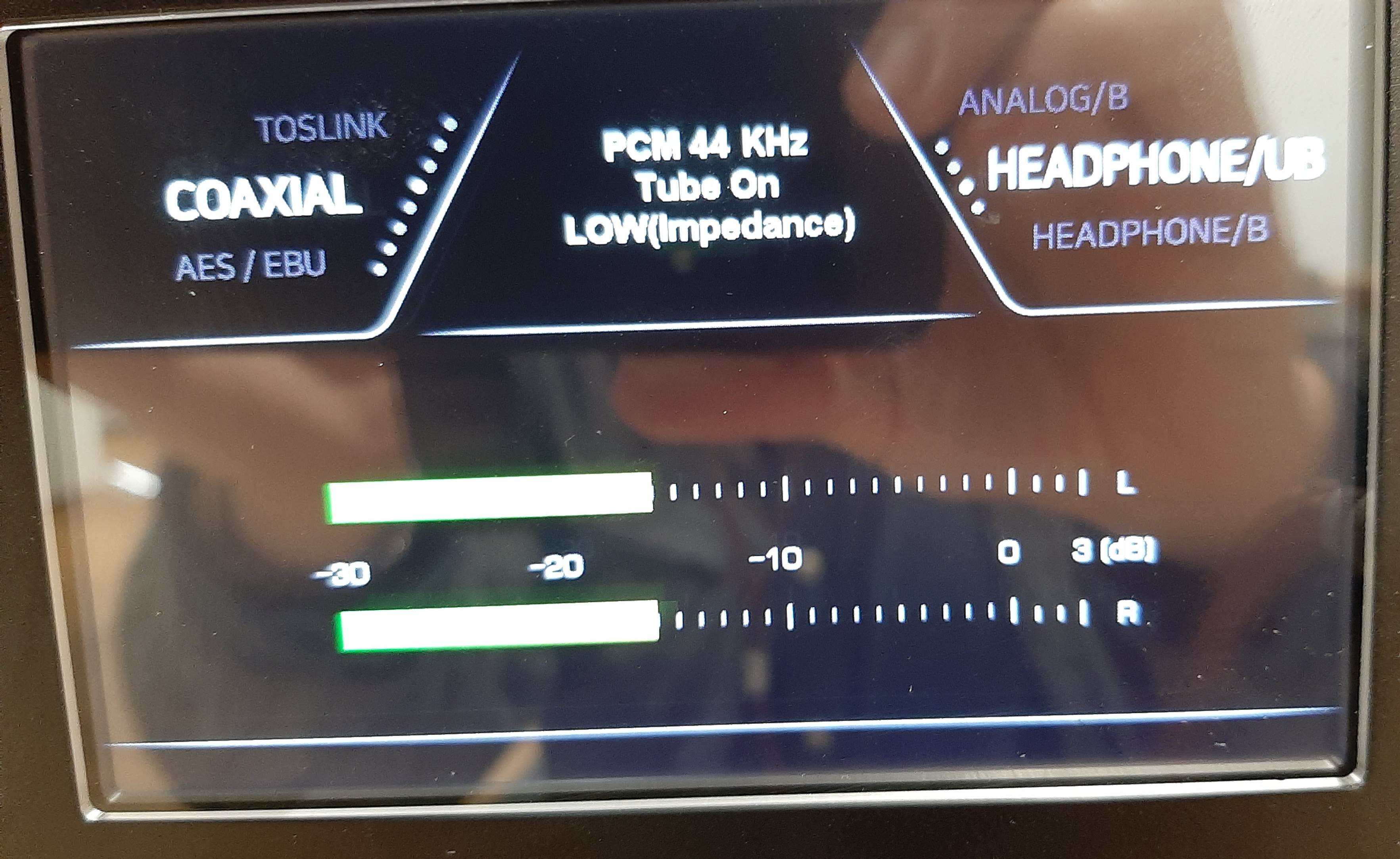 Je passe sur le Meze empyrean. Même morceau, même position tubes et gain sur low et même réglage du niveau. Outch ! ça ne match pas du tout ! c'est lent, c'est mou, terne, sans vie ! je sens que le casque à pourtant un potentiel mais pas du tout exploité. Je change de position sur transistors au lieu de tubes, je met le gain sur high, je monte le volume, c'est un peu mieux mais rien à faire, je sens bien que le cocktail audio n'arrive pas à faire "bouger" le Meze. Alors bien sur cela s'explique à mon sens par le fait que nous sommes en présence d'un orthodynamique, certes pas forcément le plus difficile sur le papier mais quand même et c'est un casque ouvert.