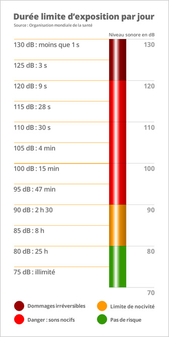 Comme le soleil, rester exposé à 80dB Leq pendant 6 heures est tout aussi dangereux que de rester exposé pendant une durée plus courte un niveau bien plus élevé, c'est donc dB X temps qu'il faut considérer.