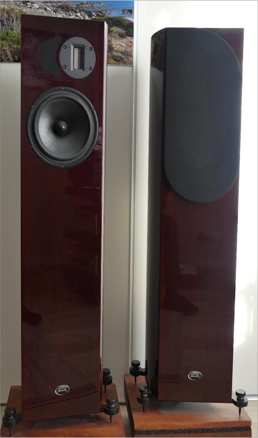 Description générale : Laque Rosewood - Etat impeccable : fonctionnement et esthétique (pas de rayures) - Colonne 2 voies 37 à 30000 HZ/88 dB - Bass réflex - mono cablage - Dimensions : 248 x 300 x 1110 mm - Grave médium : 22 cm/tweeter ruban.