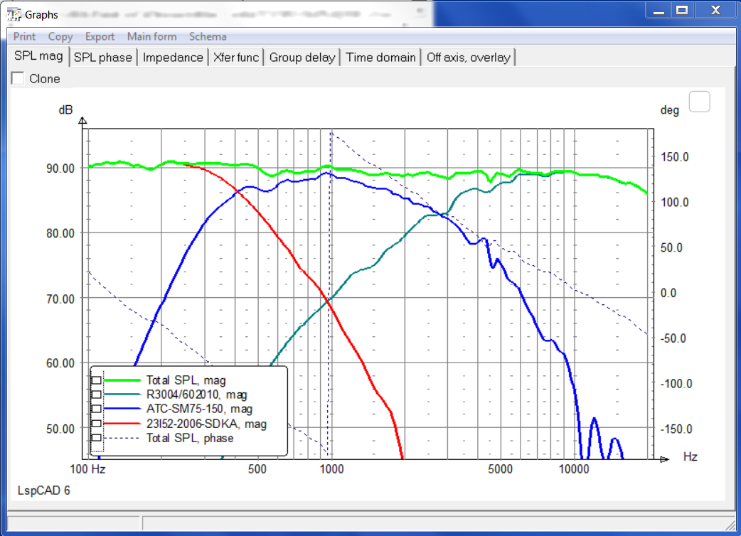 Et ici la réponse hors axe d'un ATC SM75-150 raccordé trop haut (5kHz) on voit la directivité monter en flèche à partir de 3kHz et l'accident au raccord avec le tweeter qui permet de retrouver une directivité moins forte après le raccord.
