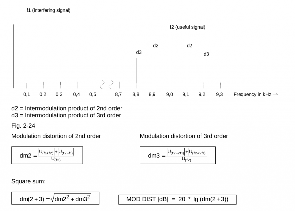 En effet, si on calcule le taux de distorsion à partir de deux produits d'intermodulation qui sont sensés correspondre à une modulation en amplitude de 100 % , soit deux produits situés 6 dB sous le signal, par exemple deux produits de 1 V comparés à un signal utile de 2 V, le résultat de cette formule ne donne pas 100 % mais 100 x [rac. carr. (1²+1²)/2] = 70 %.