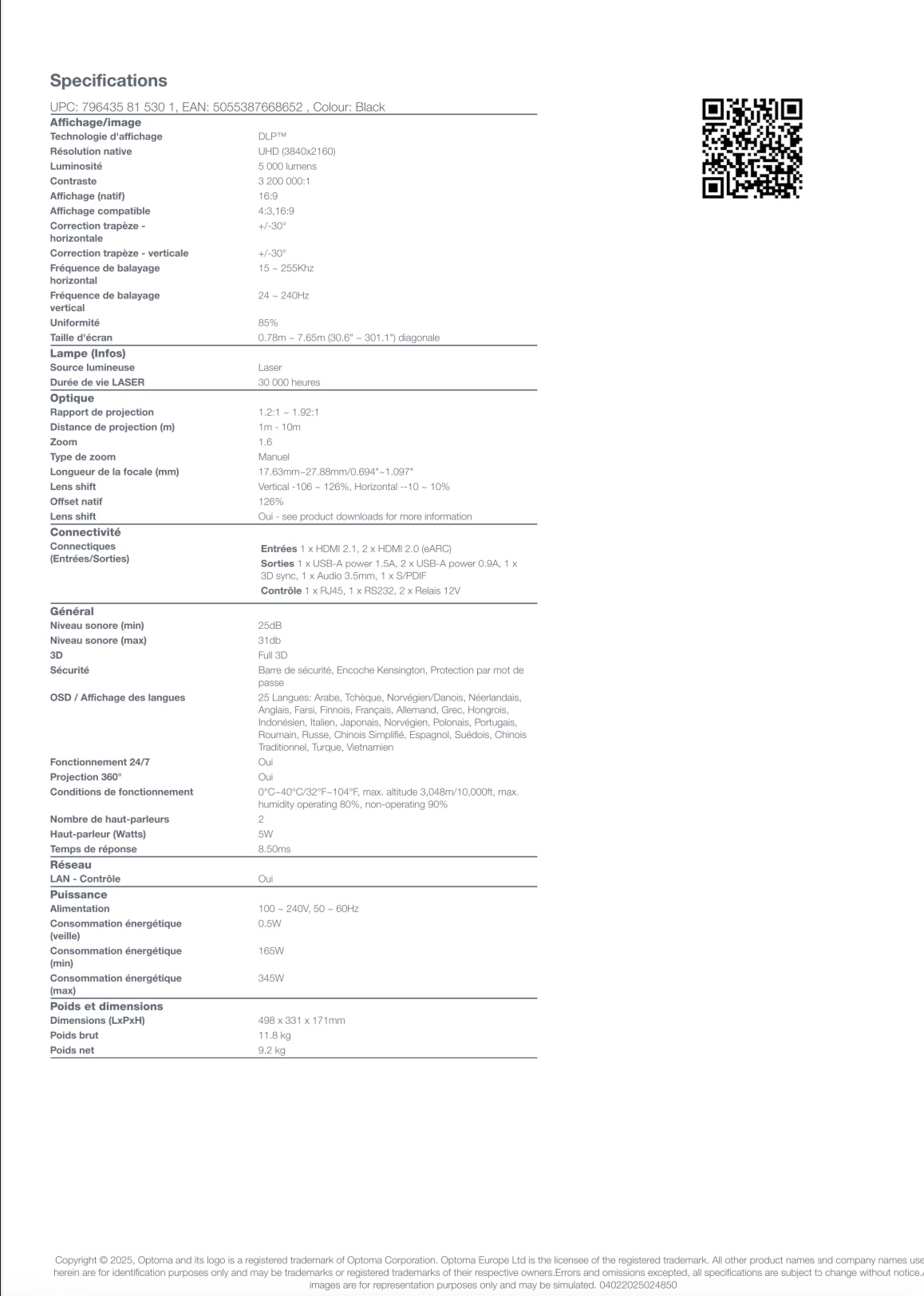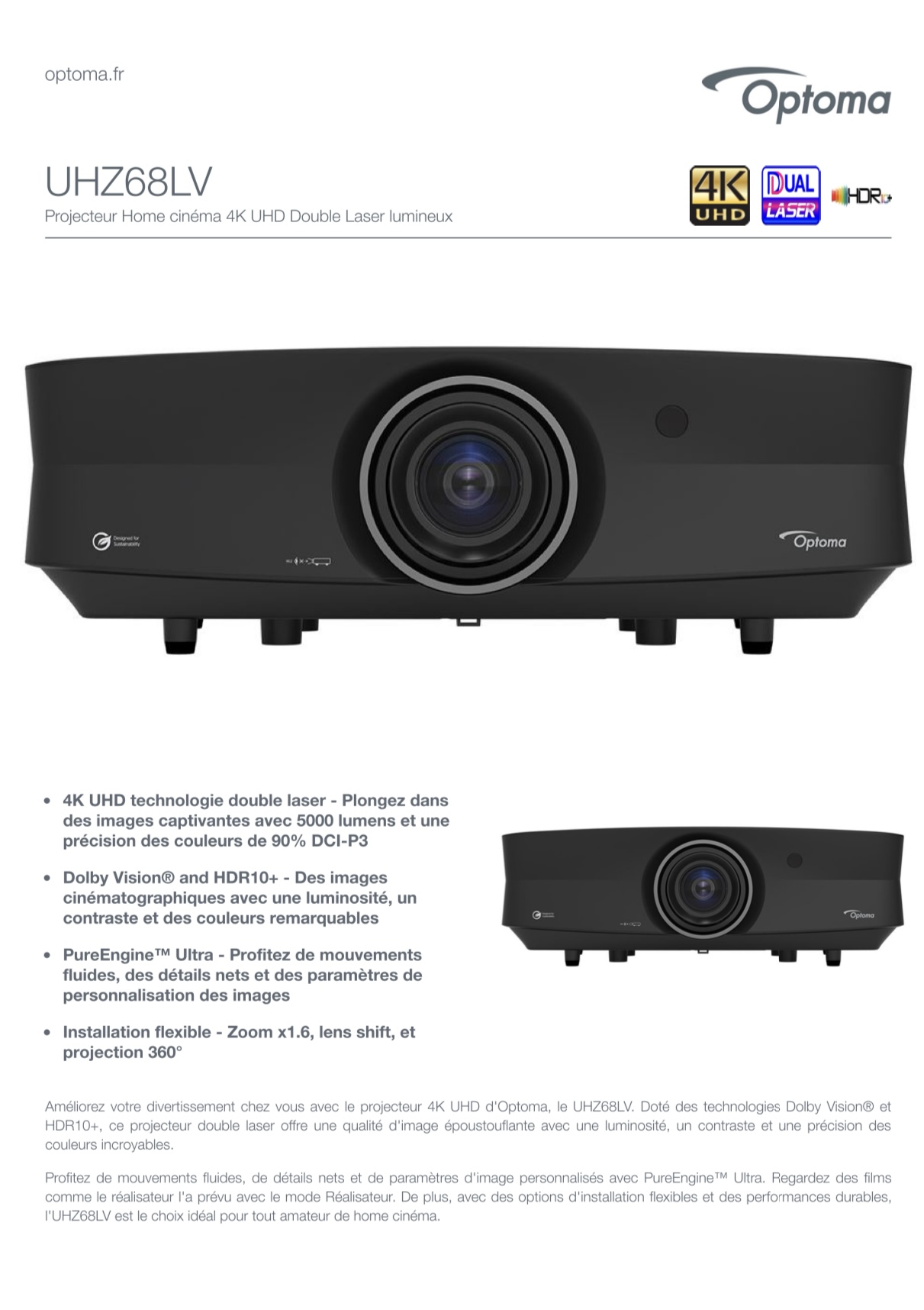 Calculateur Optoma UHZ68LV ( c’est pratique une focale longue