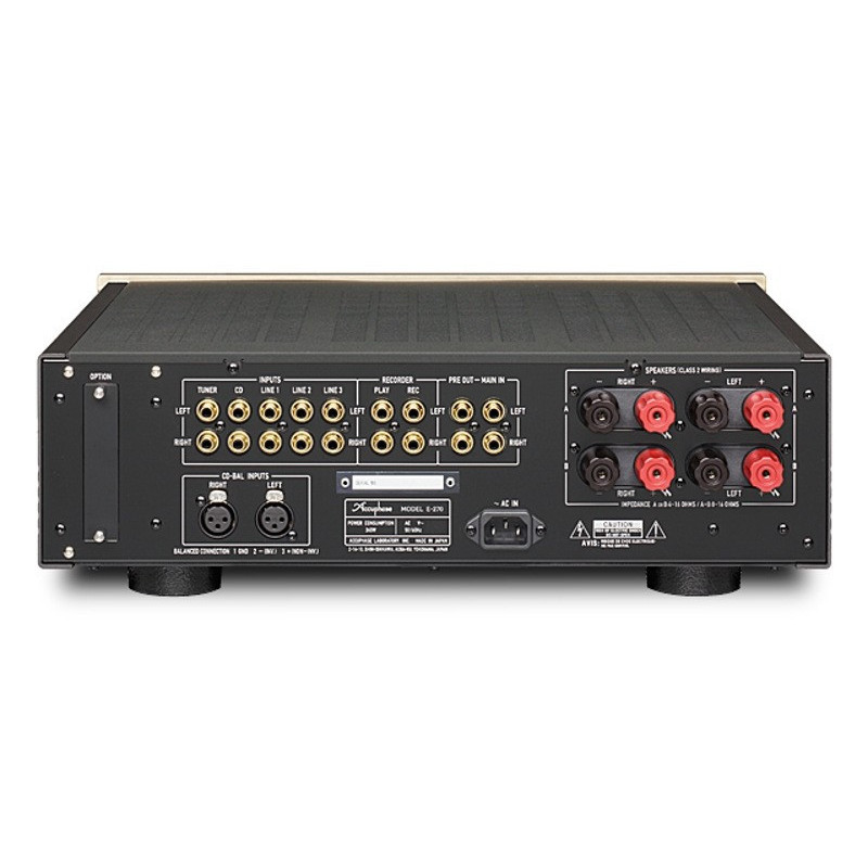 Commentaires : Caractéristiques Techniques Accuphase E-270: - Segment : Très haut de gamme - Type : Ampli Stéréo - Nombre de canaux : 2 - Type ampli : Classe A/B - Puissance : 2x 90 Watts RMS 8Ω - 2x 120 Watts RMS 4Ω - Fréquences : 20 Hz - 20 kHz - Signal Bruit : 106 dB - Convertisseur : Optionnel Accuphase DAC-40 690€ - Entrées : 1x XLR Stéréo. 5x RCA Stéréo. 1x Record RCA Stéréo. 1x Main In. - Sorties : 1x Record RCA Stéréo.1x Préout - Dimensions (LxHxP) : 465 x 151 x 420 mm - Poids : 20 kg