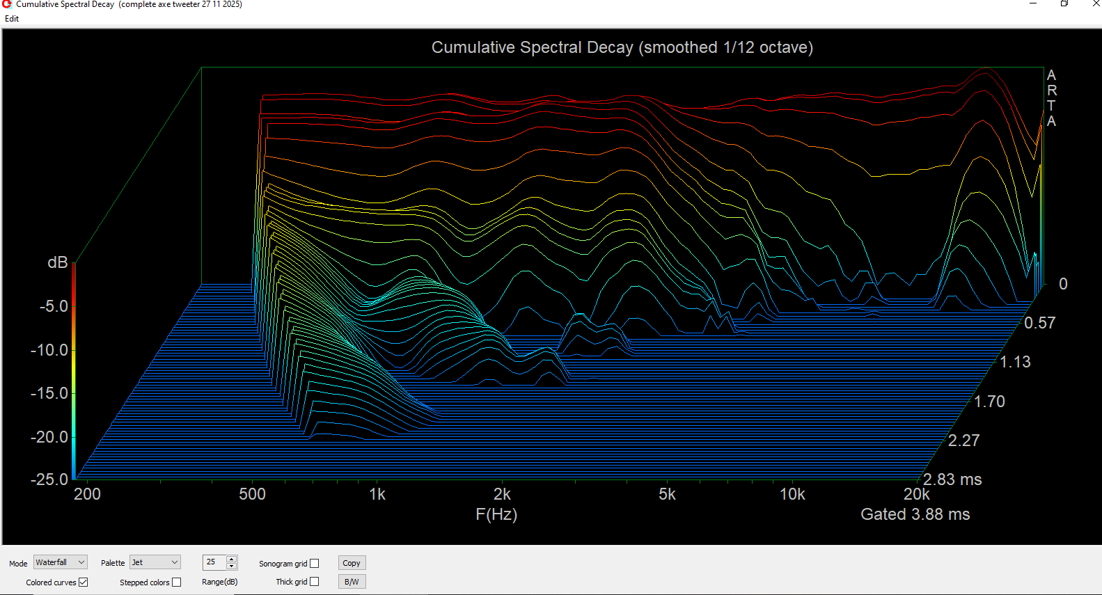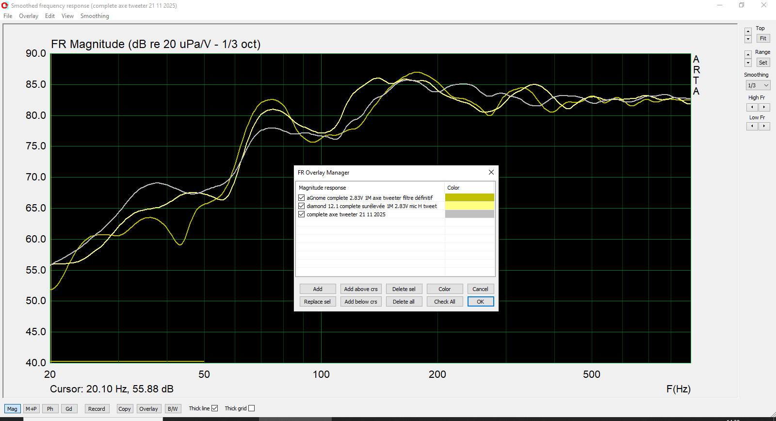 Bref, aujourd'hui j'ai passé une partie de la journée à mesurer certains paramètres dans l'axe et écouté le résultat vs une de mes Diamond12.1. Ils m'ont conforté dans l'idée que je suis dans la bonne voie, voire la voie définitive. Je vous montre ci-dessous certaines captures, avant que je ne procède dans les prochains jours à des mesures hors-axe et d'impédances, sans oublier les tests des évents d'Alain07, dont j'ai reçu 2 exemplaires.