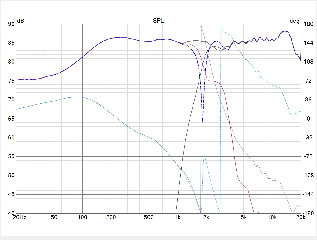 Les réponses de la simu suivante (distance d'écoute 2.5M) sont adaptées à une pièce neutre/traitée. Je publierai une modif du filtre pour pièces claires/non traitées, avec une réduction du SPL entre 2 et 20kHz.