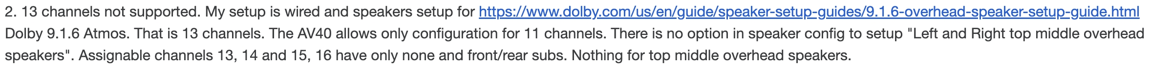 Alors : est-ce possible d'assigner explicitement les ch13,14,15,16 ou les Height1/2 pour lui dire : "Hey AVR ! Ces sorties preout w,x,y,z ne sont ni des subs ni des height speakers mais des top front overhead speakers L/R et des top rear overhead speakers L/R !".