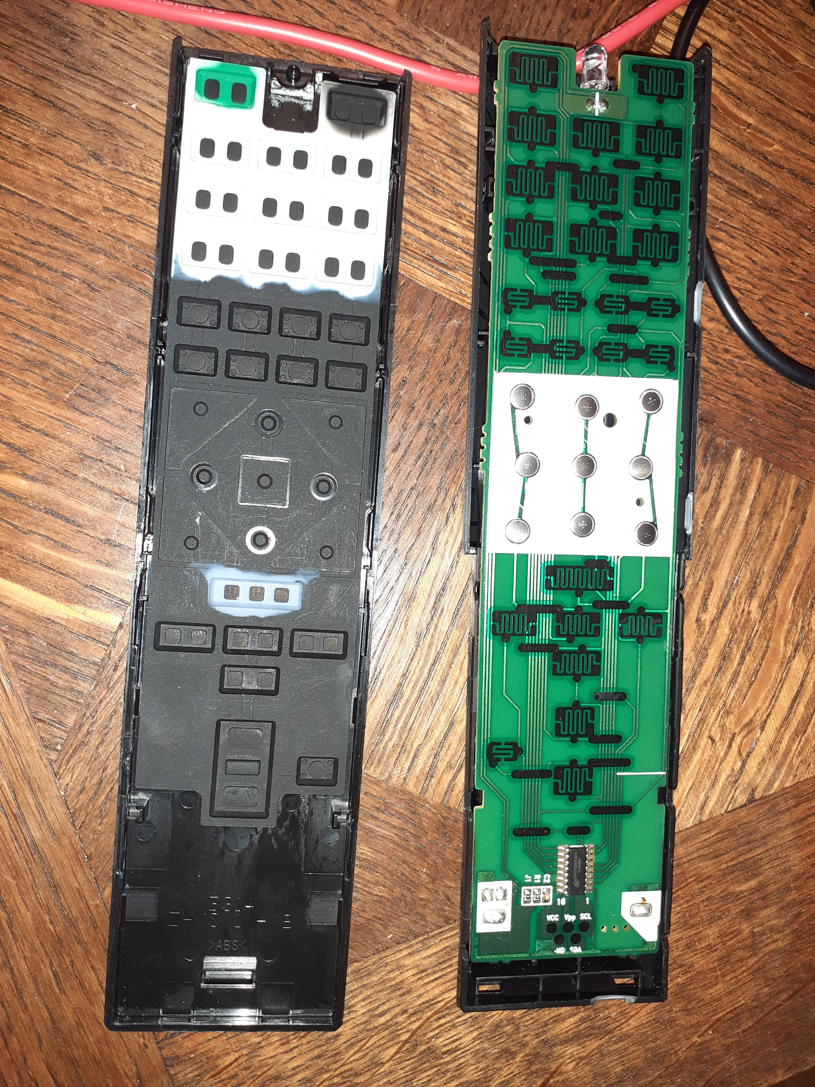 Drôle de blague : certaines touches de la télécommande officielle Sony rmt-aa320u du str-dn1080 ne fonctionnent plus (POWER, HAUT, BACK etc). Sachant que je me sers très peu de la télécommande originale. Je voulais relancer une calibration. En ouvrant, je me rends compte qu’il y a plein de straps entre les touches avec des scotches et une matière conductrice. Il a suffi qu’un strap saute pour que ces touches ne soient plus actives. C’est impossible à reprendre avec de la soudure.
