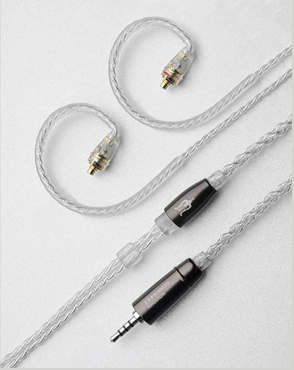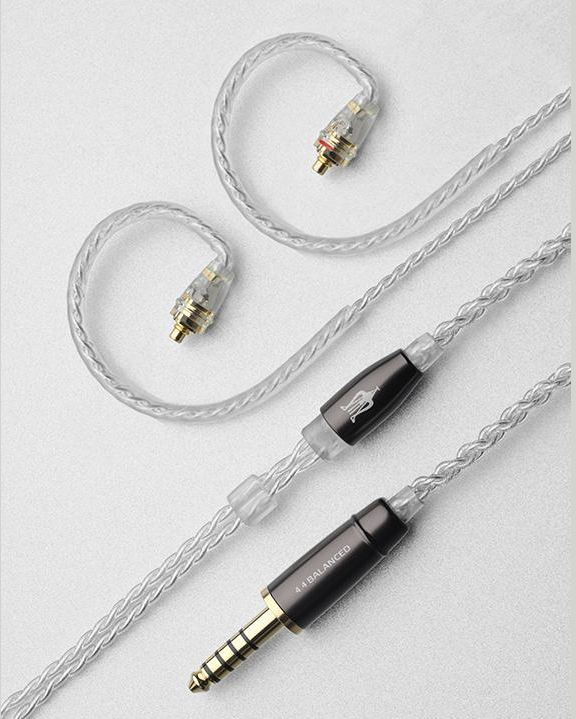 Le câble fourni est de très bonne facture, il utilise des matériaux de très haute qualité. En effet, la prise jack 3,5 mm à brancher à la source d’amplification est plaqué rhodium. Cette terre rare est une molécule fine, qui a comme avantage de réduire considérablement les aspérités lorsqu’elle est utilisée en tant que métal de plaquage. Ainsi, la surface de contact est meilleure qu’en présence d’un plaquage or ou argent. Le rhodium ne n’oxyde pas à l’instar de l’or, et sa conductivité est assez proche de celle du cuivre; ce qui garantit aussi la neutralité tonale. Les connecteurs MMCX aux écouteurs assurent un excellent maintien et la possibilité d’une connexion symétrique.